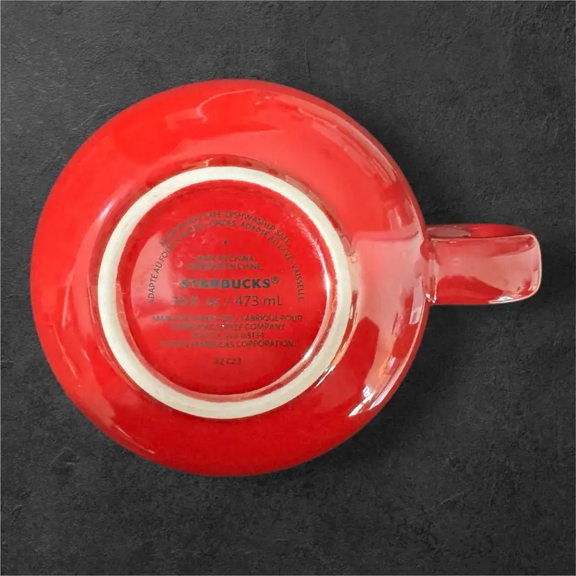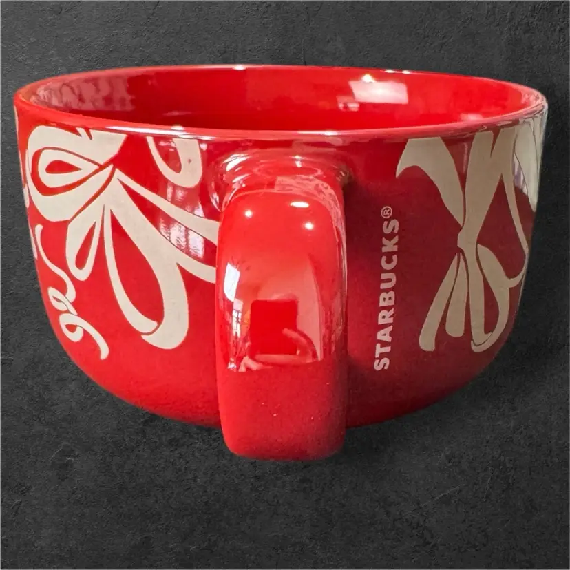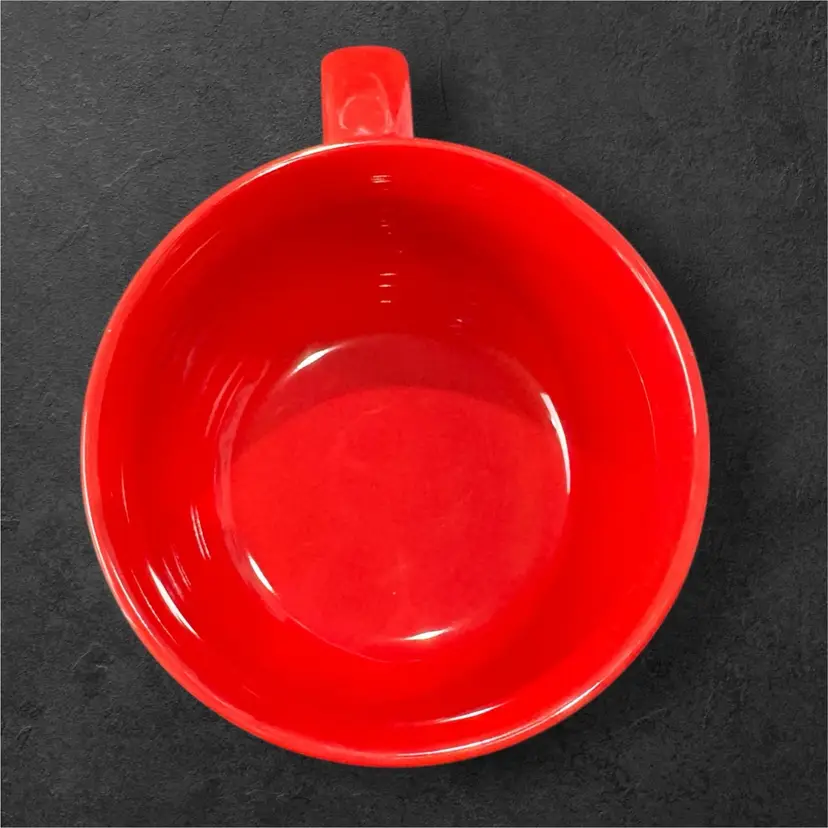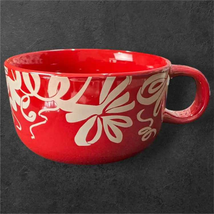 High gloss cherry red, short and stout with a shimmery white ribbon around the entire thing, this mug holds 16 oz while grabbing all the attention. In mint condition, it is 4.75” in diameter and 3” tall, perfect for a hot cup of soup or a hot beverage. And wouldn’t an engagement ring look amazing tied to the handle?!
