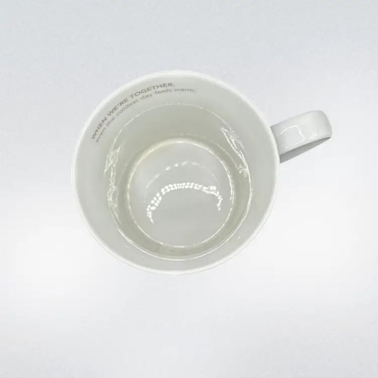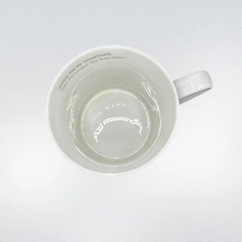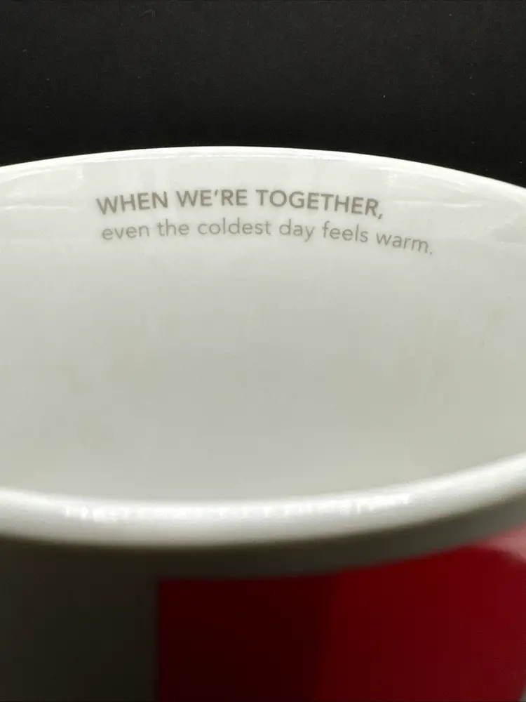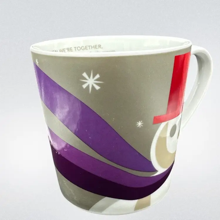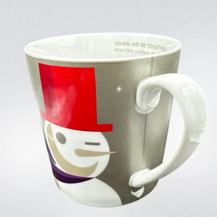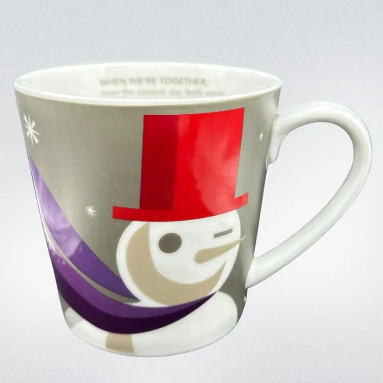 The Starbucks Coffee Mug 2011 Snowman 'When We're Together' even the coldest day feels warm. Holiday Christmas 16oz is a collectible advertising item featuring a festive design perfect for the holiday season. This original coffee mug from Starbucks showcases a multi-color snowman and the heartwarming message 'When We're Together', making it a special addition to any coffee and tea enthusiast's collection. With a 2011 creation date, this mug captures a sentimental theme that is sure to bring joy and warmth to its users during the festive season. There is a small area with no color under the handle , see photo.