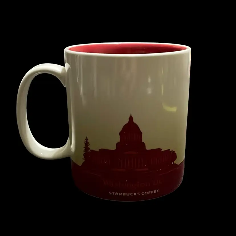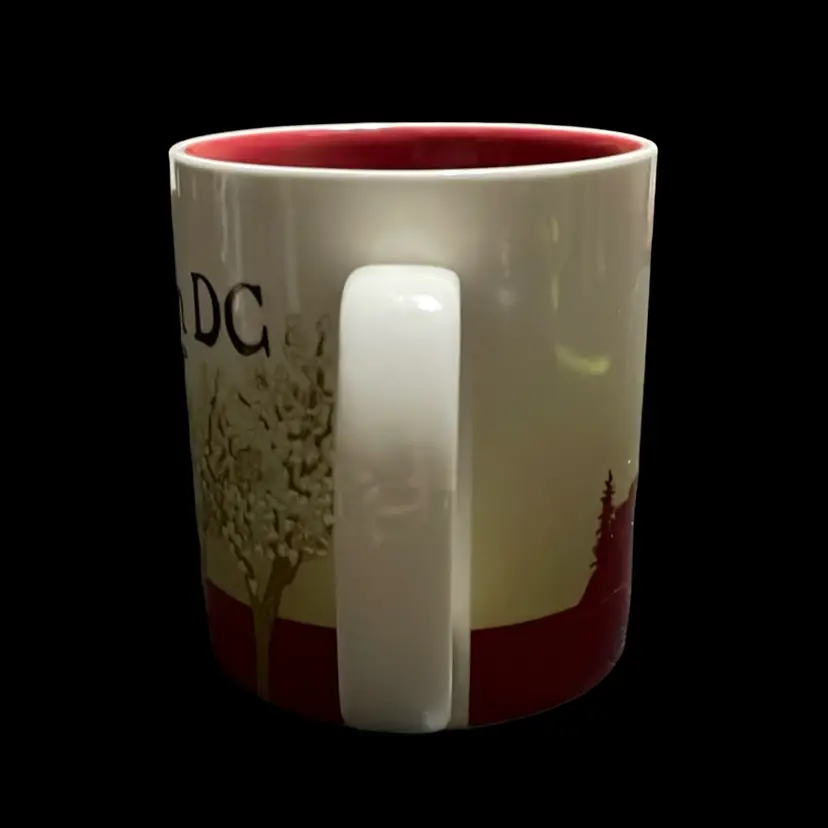 This Starbucks mug represents Washington DC in their Collector Series. It features a beautiful red color with the iconic Starbucks logo and scenery from the city