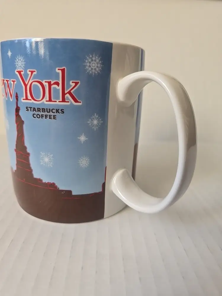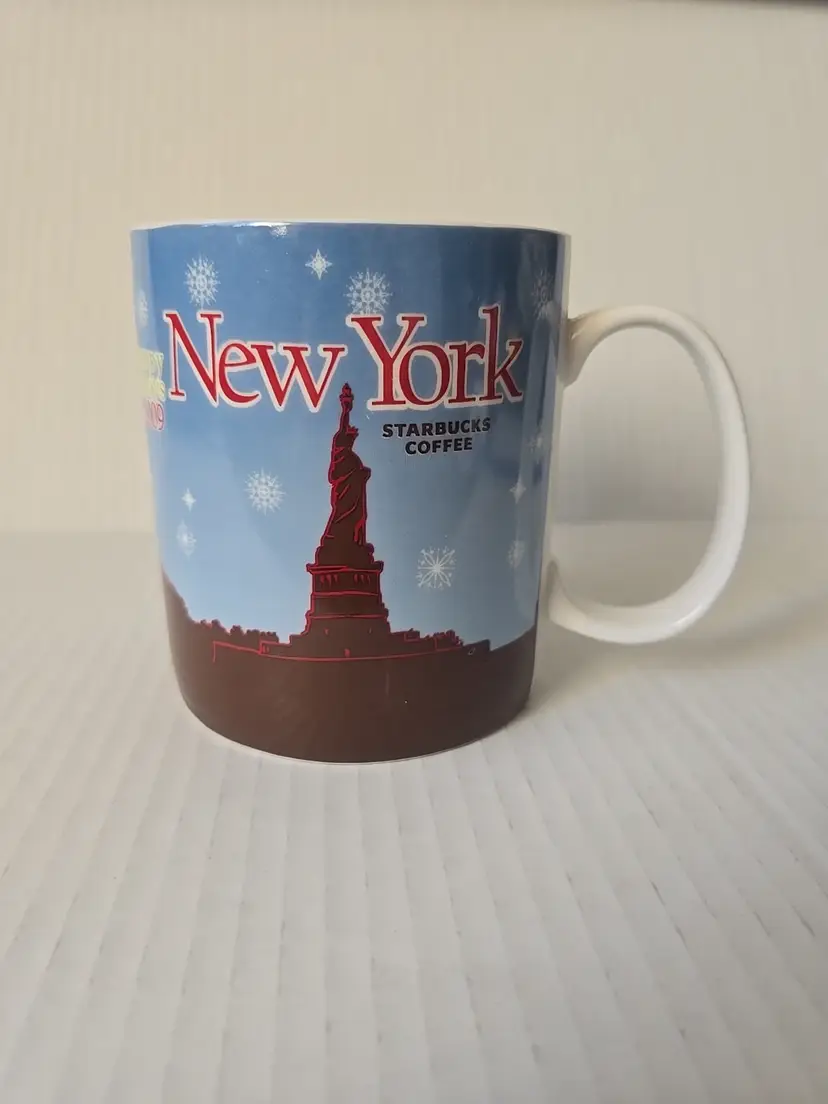 Classic Starbucks collectible from 2009, this “Happy Holidays New York” mug displays a festive rendering of the New York skyline and Statue of Liberty. Holds 16 fl oz (473 ml). Marked for Starbucks Coffee (©2009).