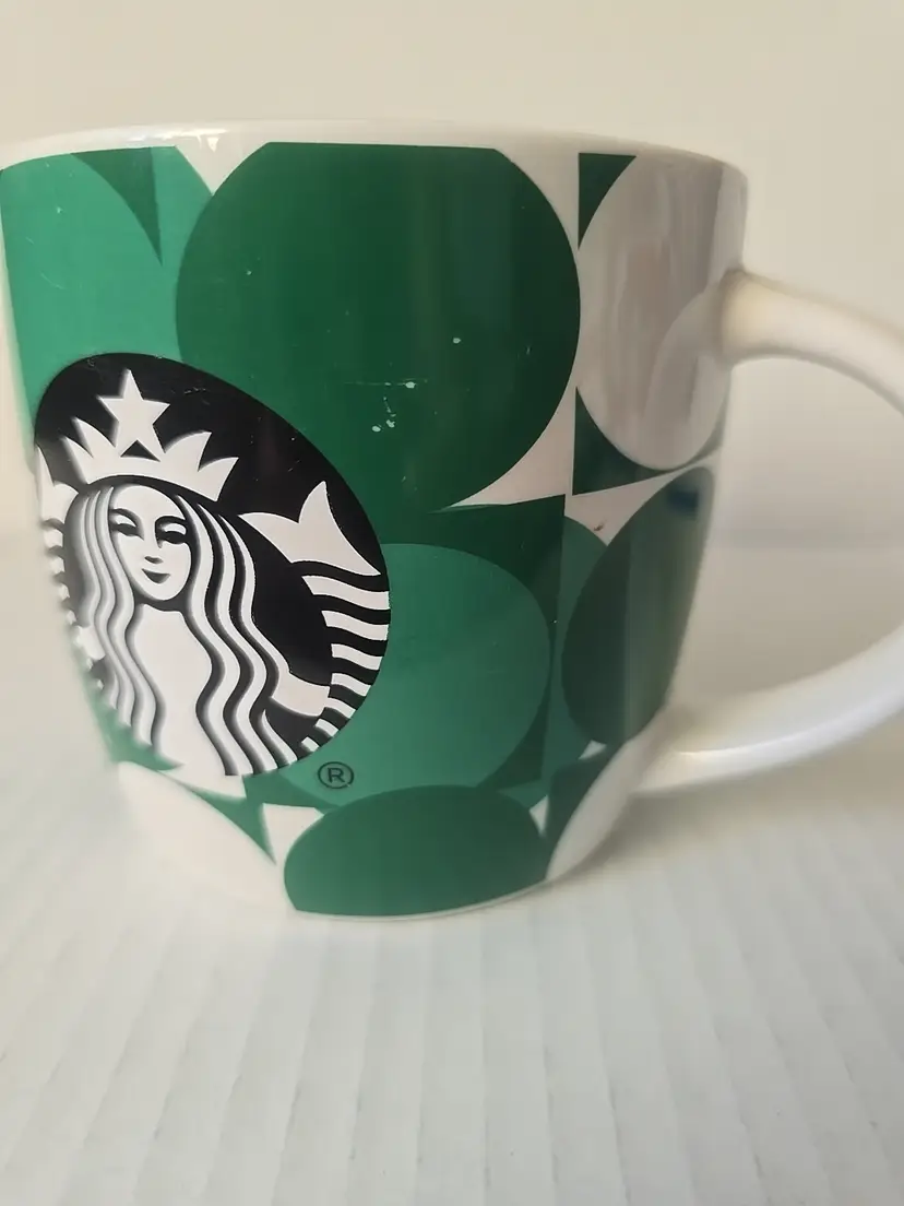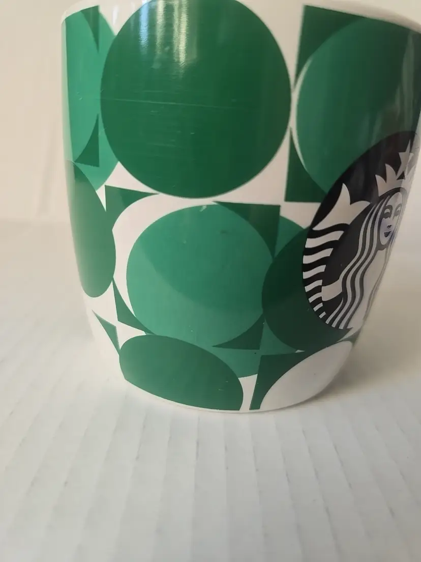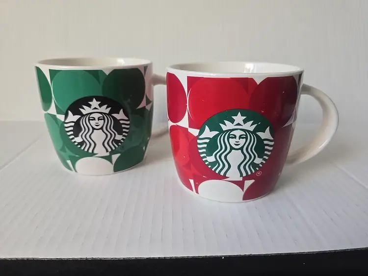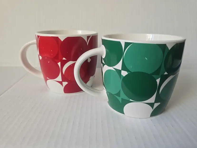Festive pair of Starbucks 14-ounce 2018 holiday mugs featuring bold red and green polka dot / overlapping circle designs and the Siren logo. Bright, usable, and decorative — ideal for coffee, hot cocoa, or holiday display.
