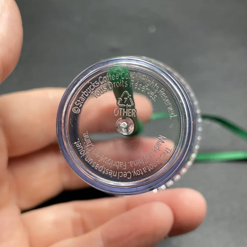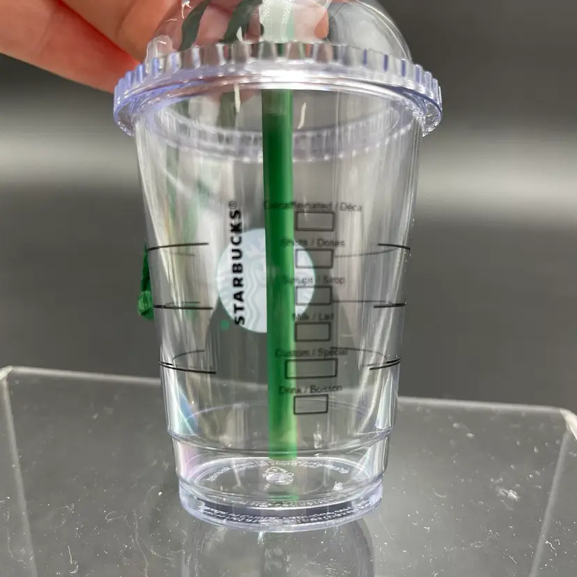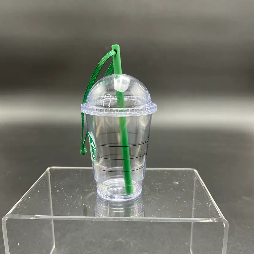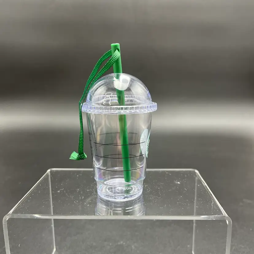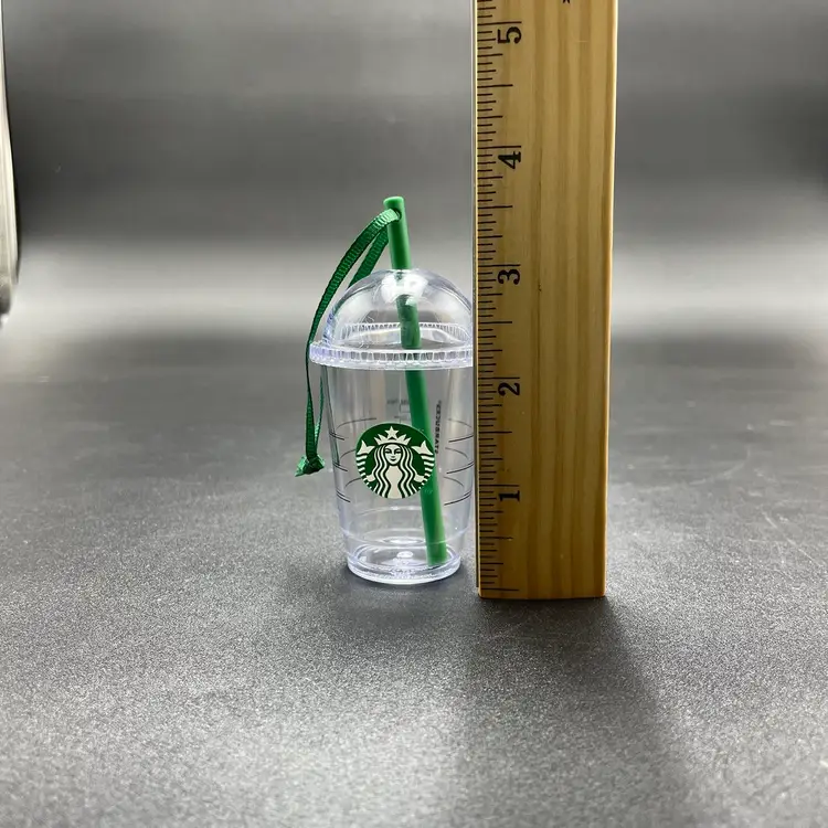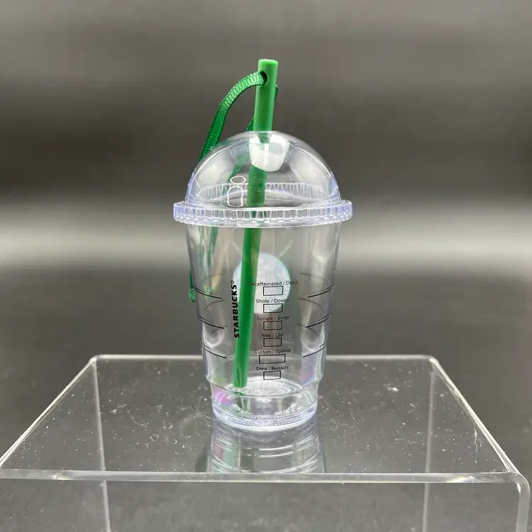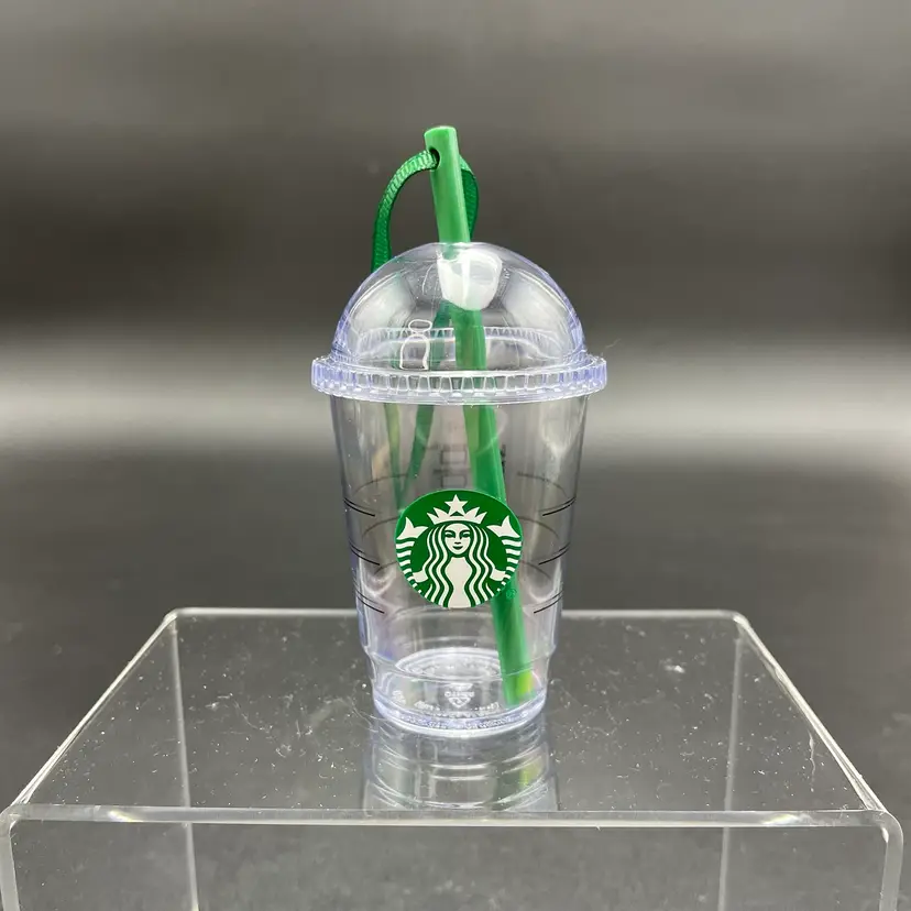 This is a vintage Starbucks miniature clear plastic Frappuccino cup with green straw hanging ornament. Measures approximately 3.5" tall. No major flaws.
