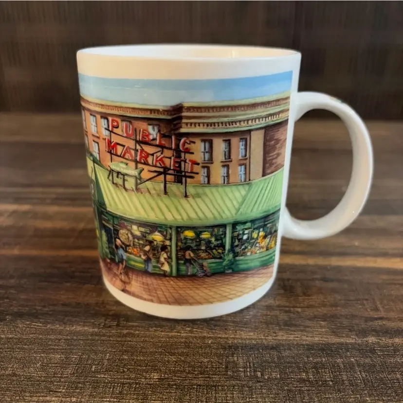 Starbucks Seattle Pike Place Market collectible mug featuring a colorful illustration of the famous Public Market Center and Farmers Market. The artwork captures the iconic Seattle landmark and reflects the city where Starbucks was founded.