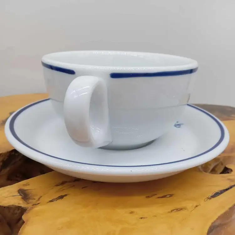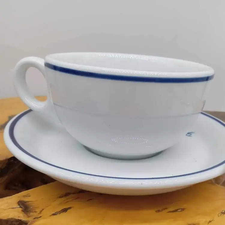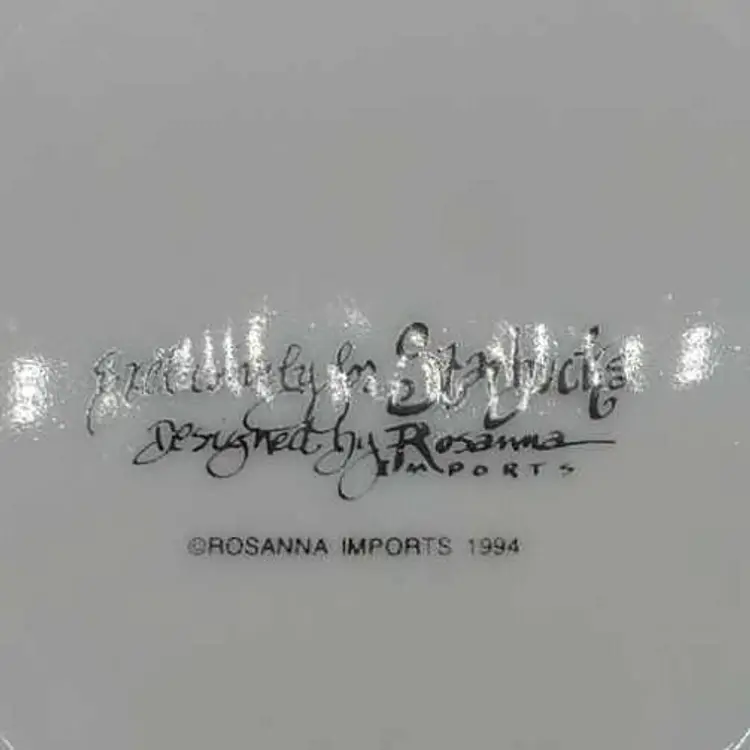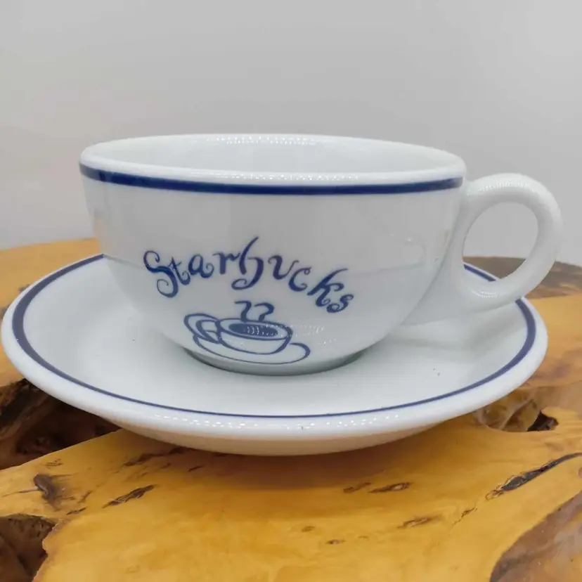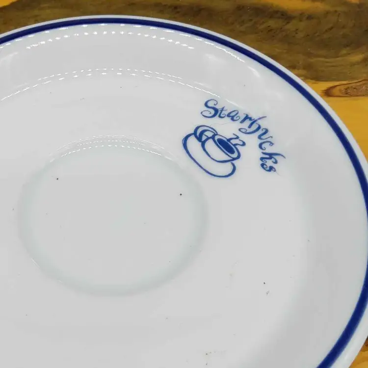 Here's a cute Starbucks teacup and saucer. They are white with a blue decal and stripe. Made in 1994, the saucer is 5 3/4 inches in diameter and the teacup is 3 13/16 inches in diameter. There are no chips or cracks.