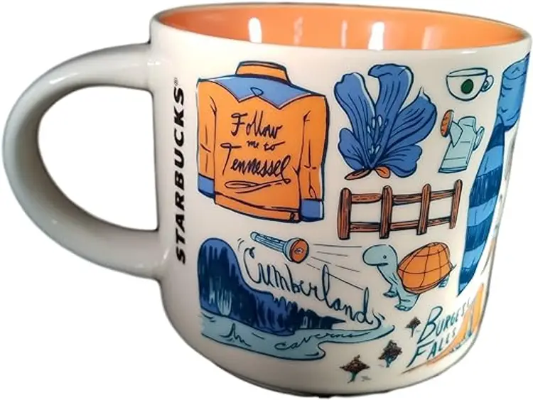 NEW Starbucks Tennessee Been There Series Ceramic Coffee Mug Set, 14 oz Tennessee Coffee Mug features all the things the state is renowned for. Tennessee mug is blue and orange with an orange interior. Great Coffee Mug to add to your Starbucks Across the Globe Collection. SKU: A-8