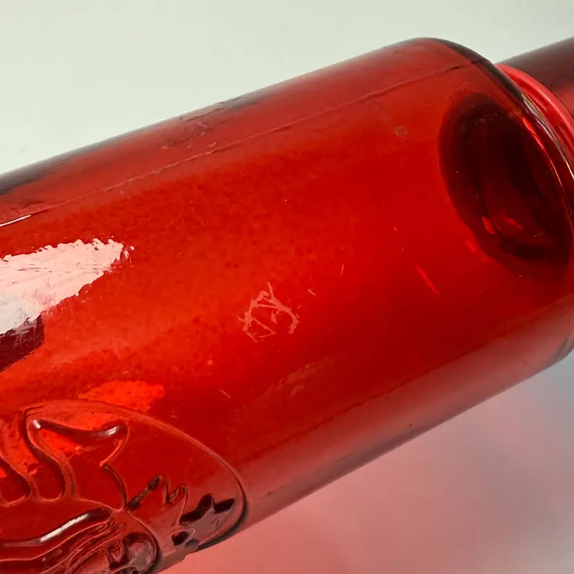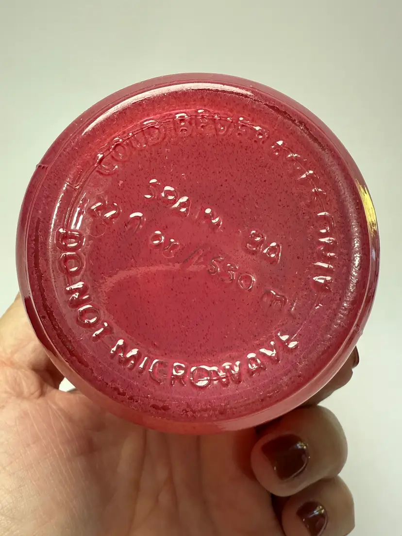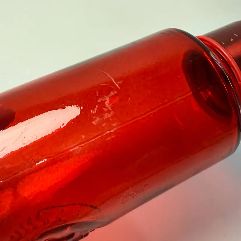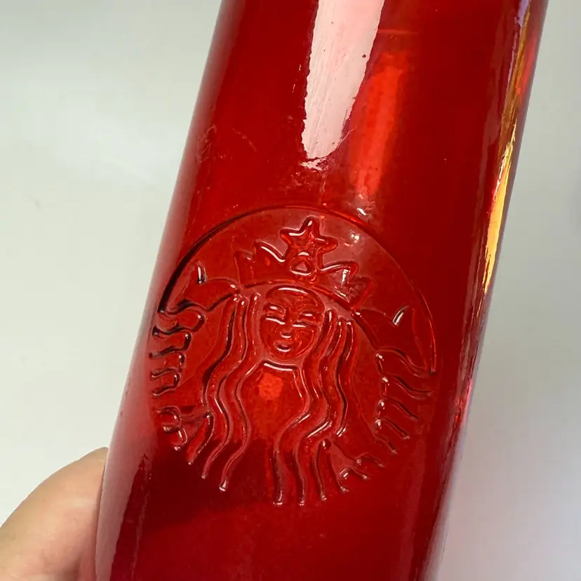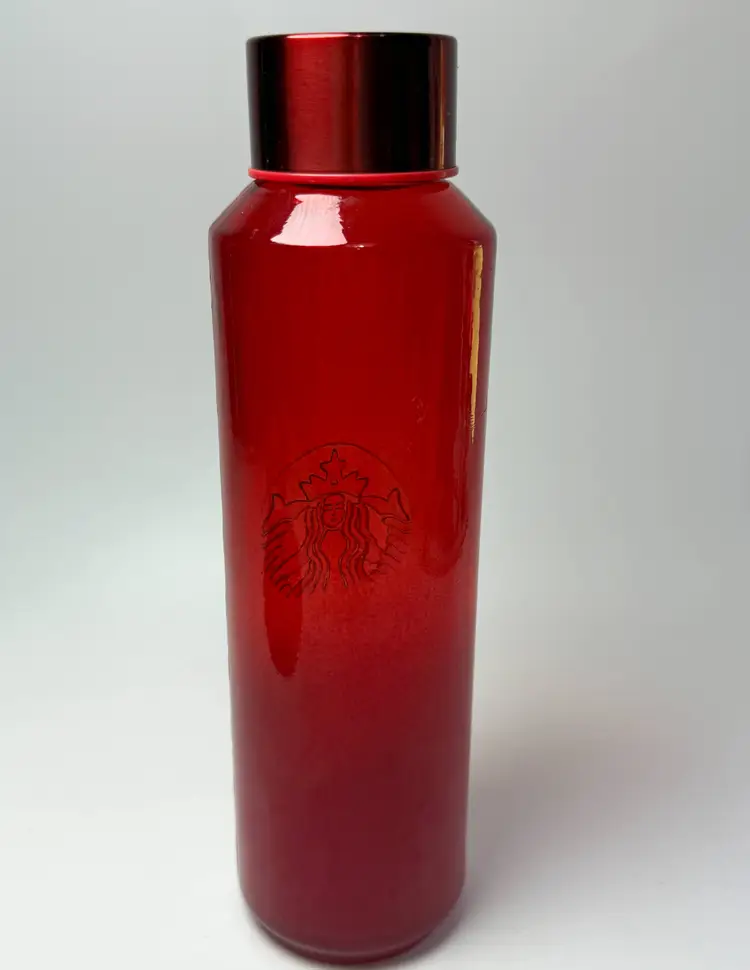 Starbucks Winter 2022 Red Ombre Embossed Siren Logo Glass Water Bottle 22oz Used with red top. Made in Spain. No chips, no cracks. Some light wear as shown-surface scratches. 10" tall.