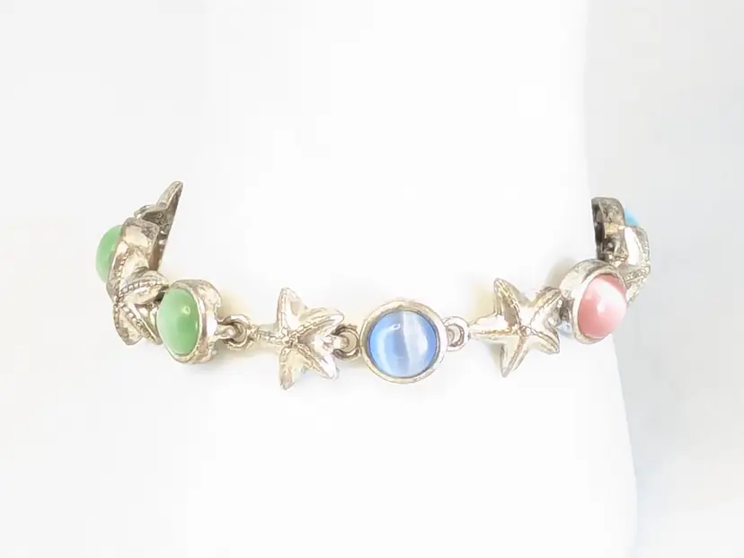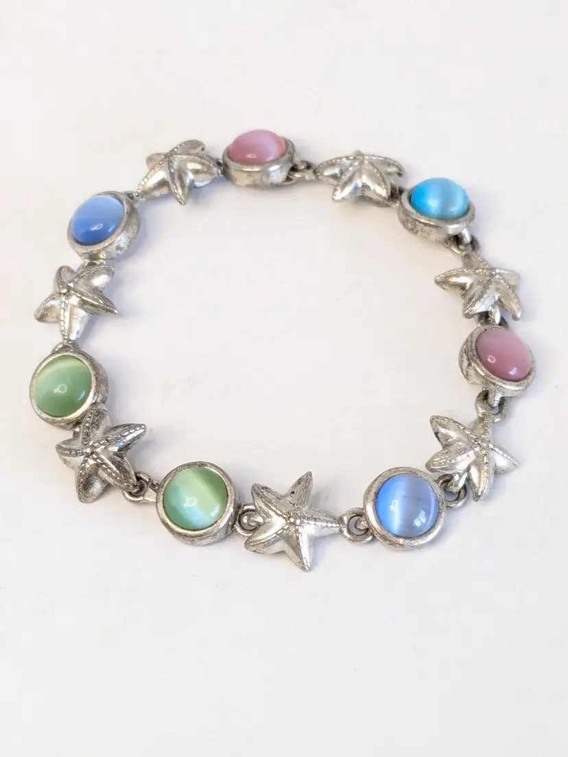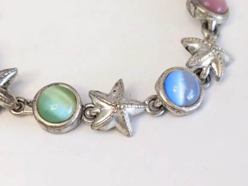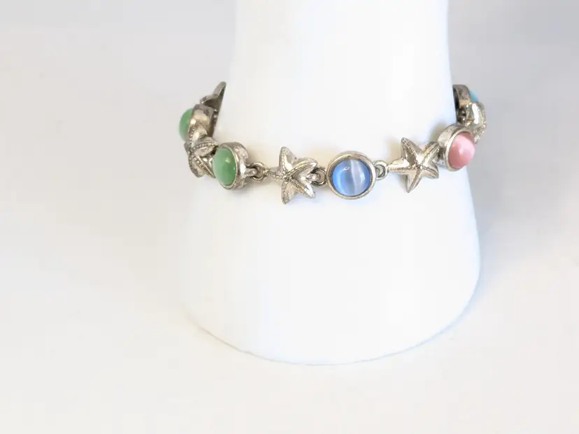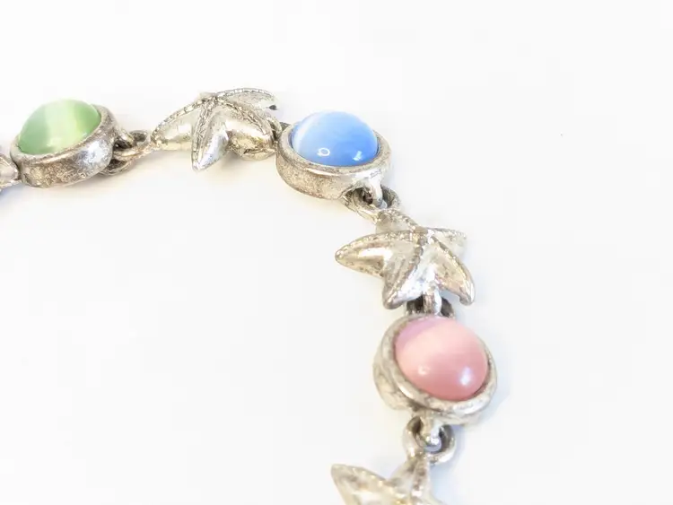 Good condition. Features alternating starfish and pastel cabochons in silver tone. Magnetic closure. Measures 6 3/4". EN2