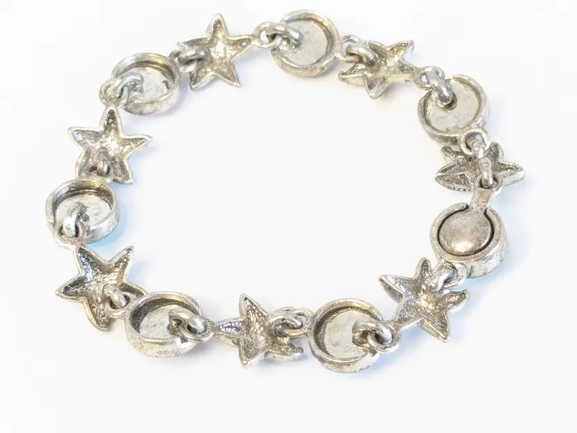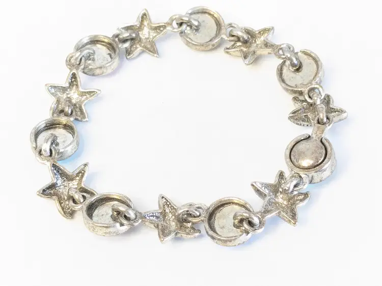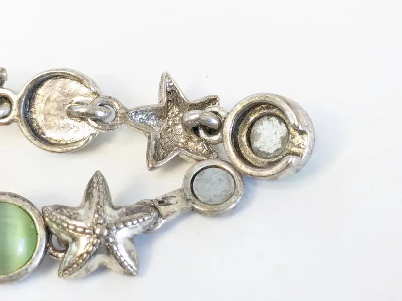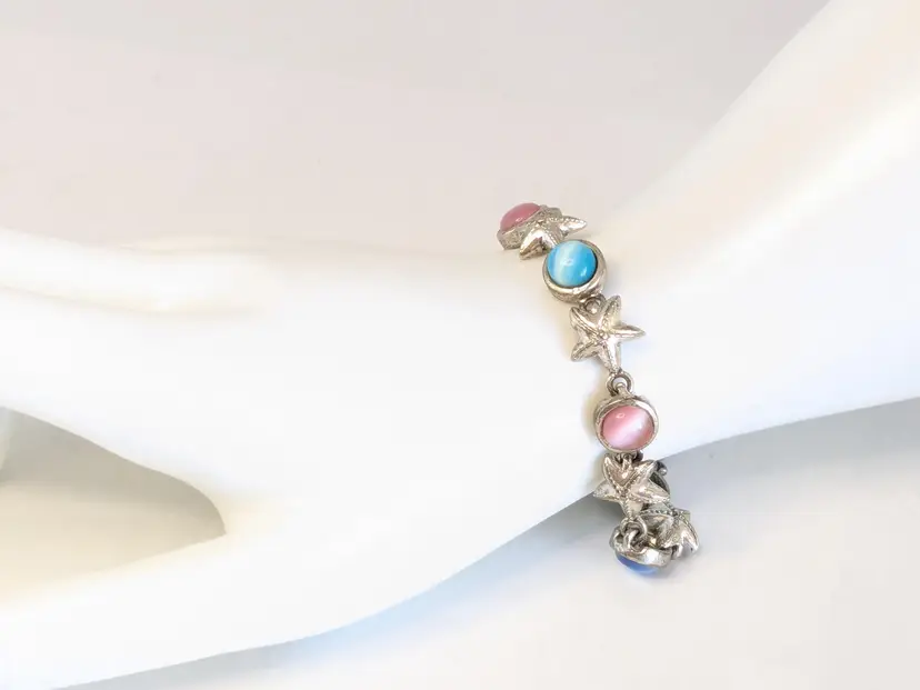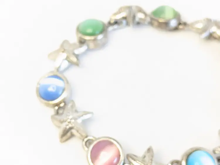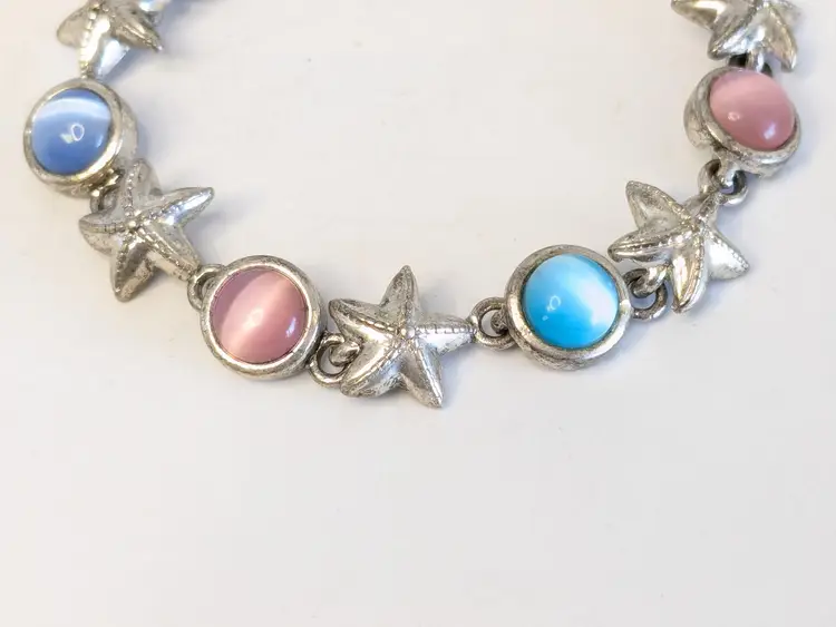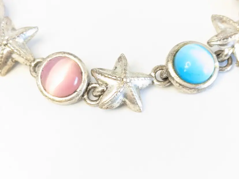 Good condition. Features alternating starfish and pastel cabochons in silver tone. Magnetic closure. Measures 6 3/4". EN2