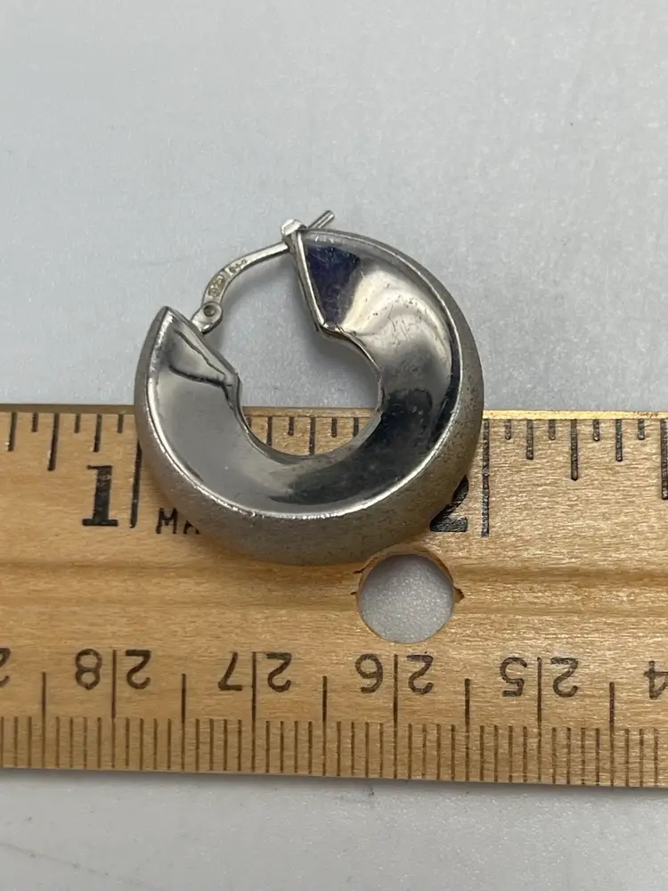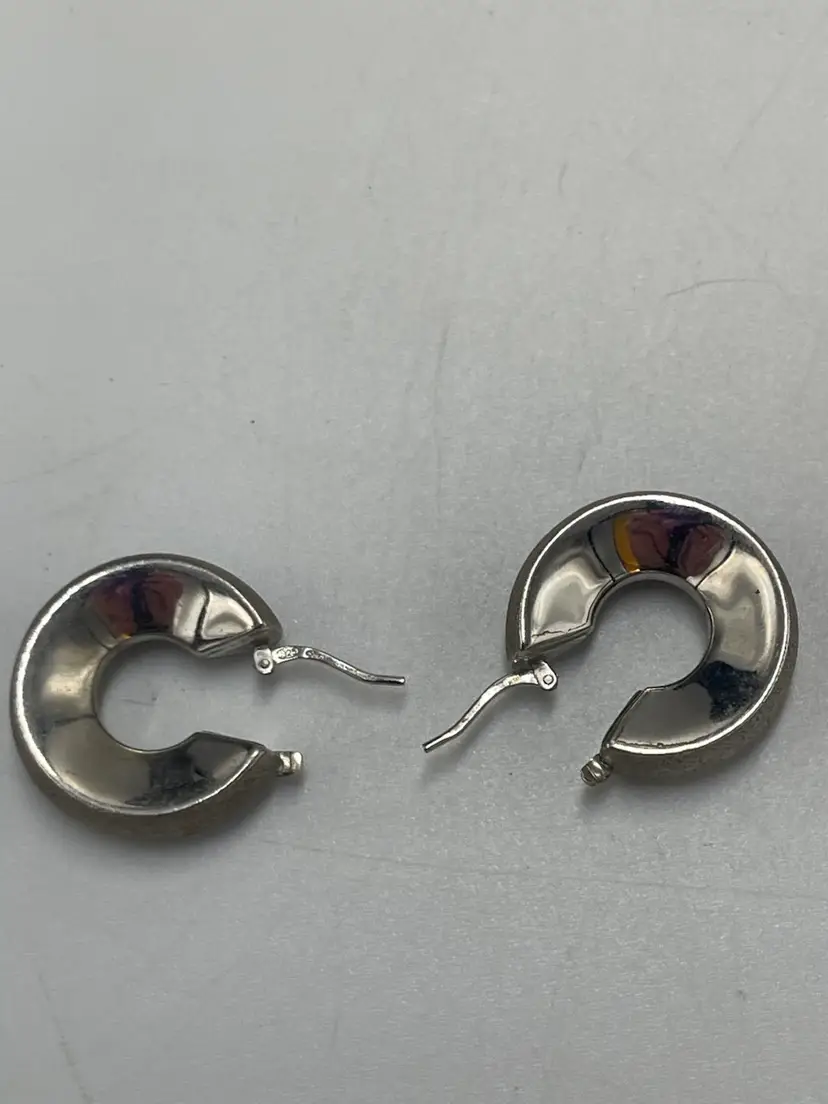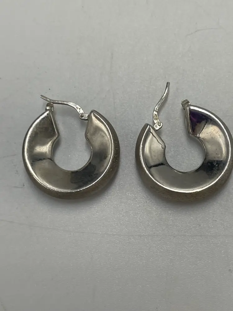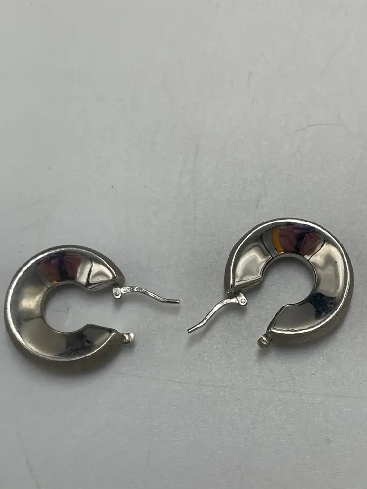 These statement earrings are crafted from 9 to 5 silver and have a textured and smooth metal finish. Perfect for the Corp. core look. They have a wide round design that will have variety to any ensemble. They were made in Peru. The closure is hinged. They are signed by the brand C plus G. Approximate measurements are 1“ x 0.25 inch and they weigh 9.21 g. Please review photos carefully. Any major flaws will be shown in the last photo. Since the item is preowned, they may show some scratches and signs of wear. There can be variations in color due to lighting. The earrings may need to be cleaned or polished.