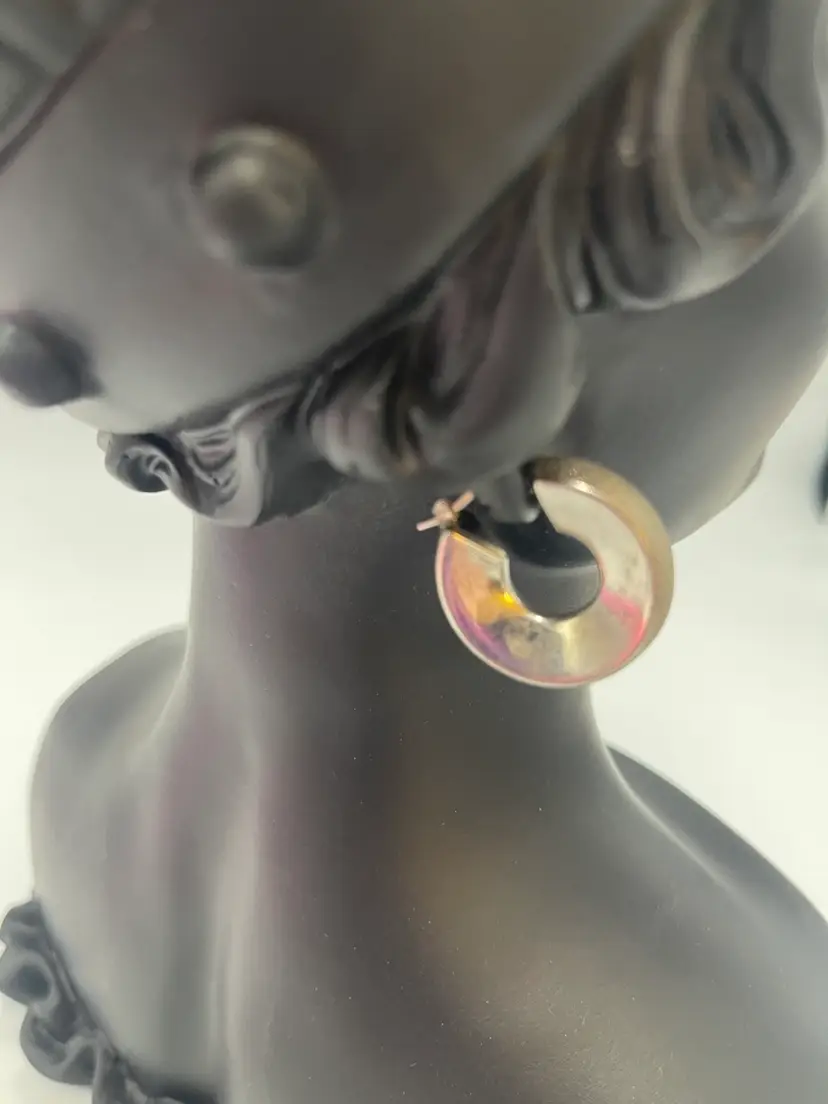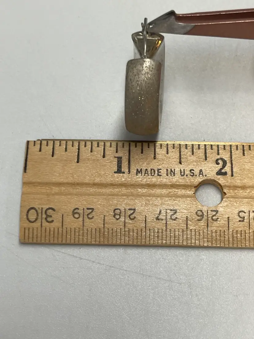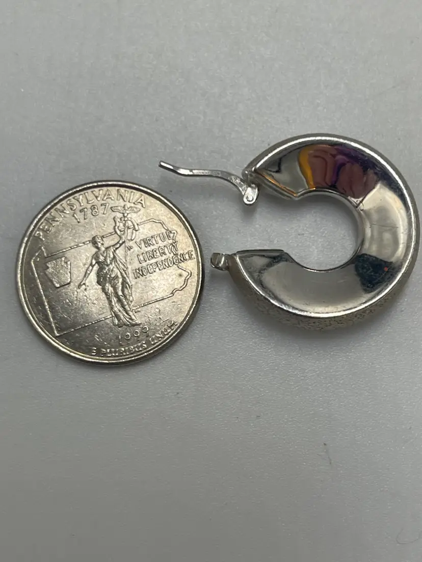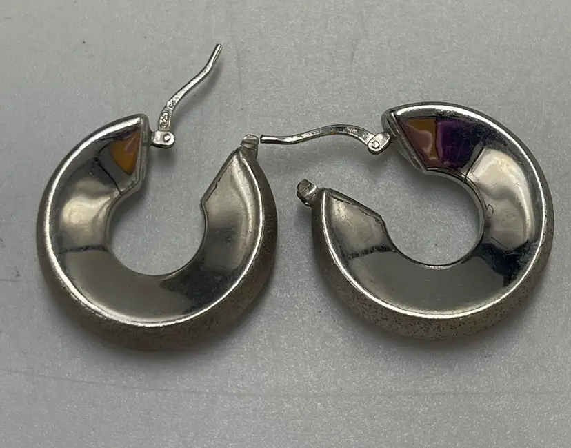 These statement earrings are crafted from 9 to 5 silver and have a textured and smooth metal finish. Perfect for the Corp. core look. They have a wide round design that will have variety to any ensemble. They were made in Peru. The closure is hinged. They are signed by the brand C plus G. Approximate measurements are 1“ x 0.25 inch and they weigh 9.21 g. Please review photos carefully. Any major flaws will be shown in the last photo. Since the item is preowned, they may show some scratches and signs of wear. There can be variations in color due to lighting. The earrings may need to be cleaned or polished.
