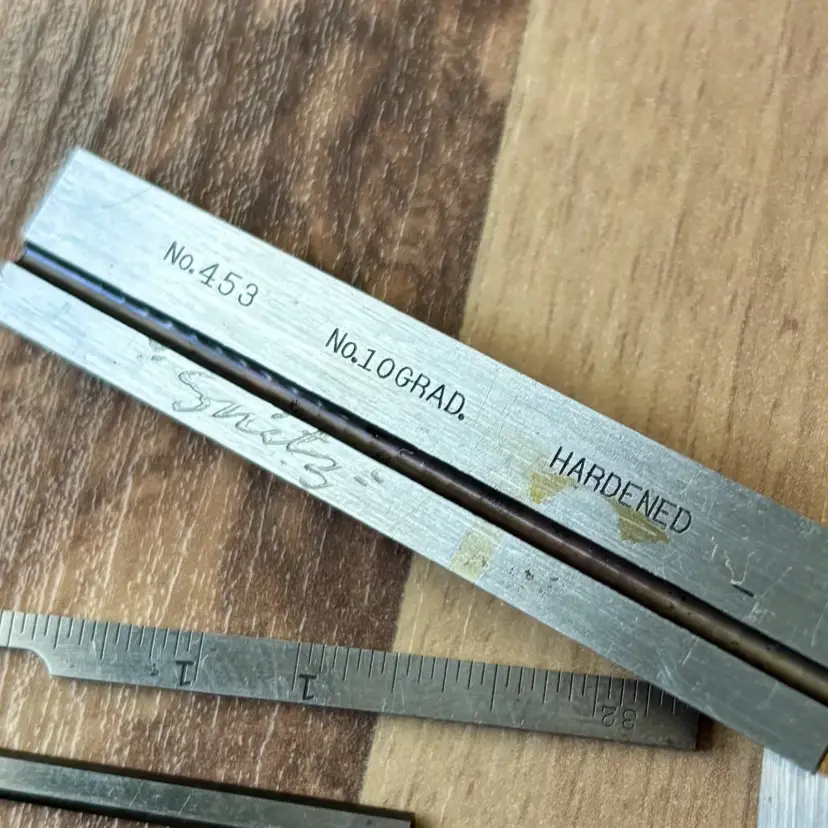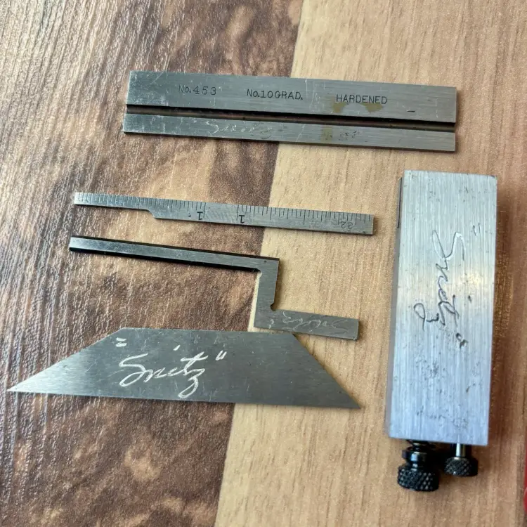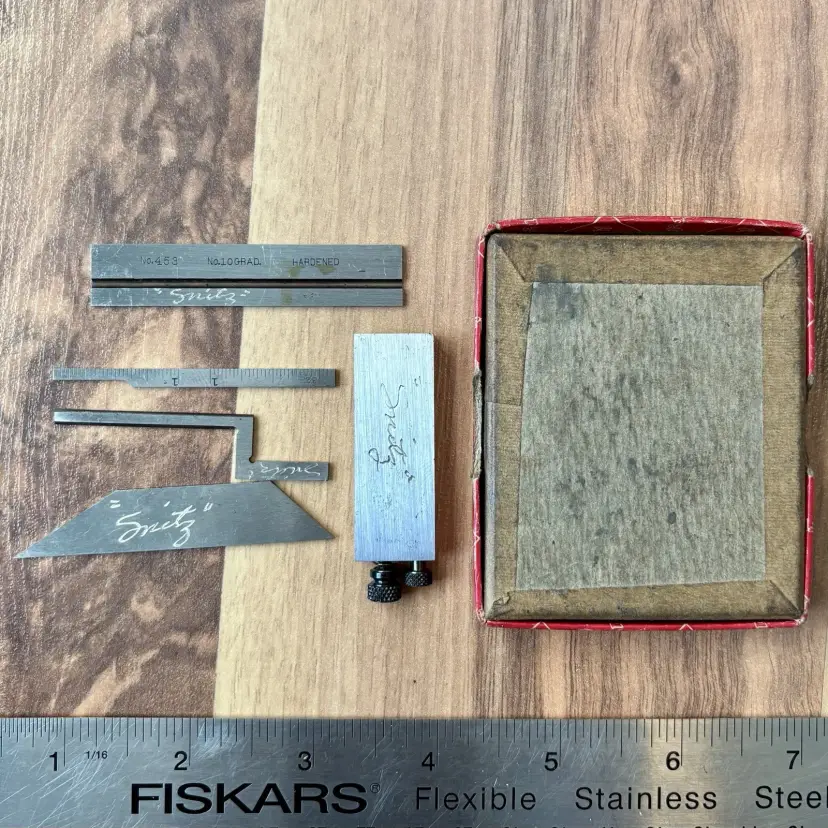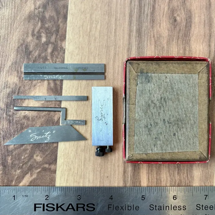 Near mint Vintage Starrett No. 453E Die Makers Square. This 2.5" Machinist Square comes with the original box and is complete with Standard, Bevel, Narrow Graduated and Offset Blades. The box does show some signs of wear and age. The double square has a prior owner mark of "Snitz" lightly engraved in some of the parts as shown in the pictures. No. 10 Graduation with 32nd and 64th increments. Hardened steel rule. The standard blade is engraved with "No.453 No.10Grad. Hardened" on one side, and "L.S. Starrett Co. Athol, Mass. U.S.A. Made in U.S.A." on the reverse. See pictures for details. Let me know if you have any questions.
