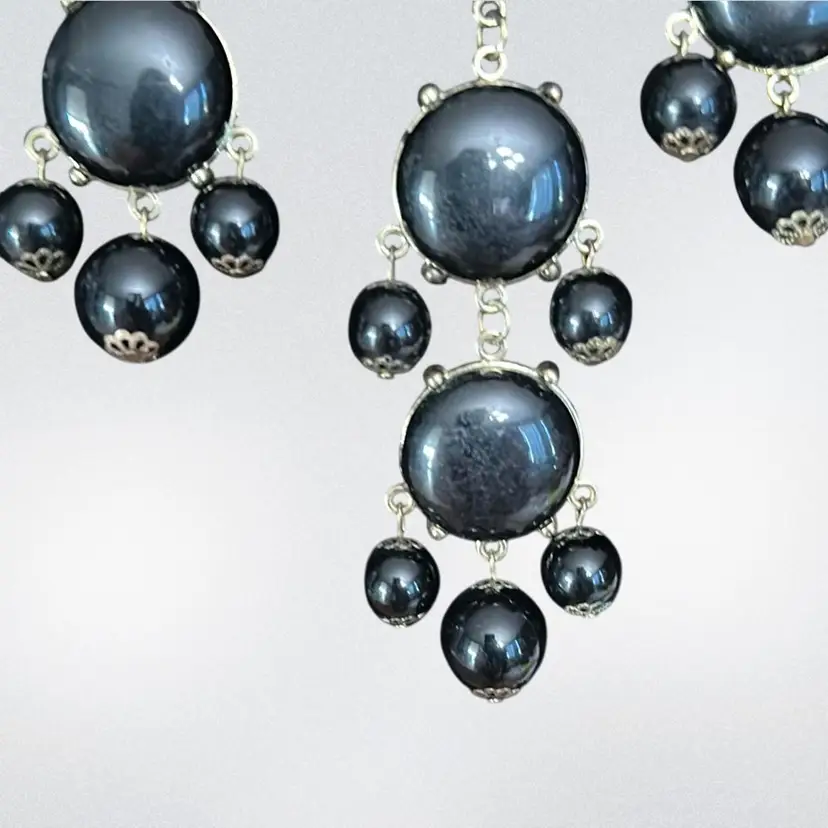 Bold statement bib necklace featuring glossy black cabochon-style stones with dangling bead accents. Designed in a tiered cascading style for an elegant yet dramatic look. Lightweight with an adjustable chain for comfortable fit.