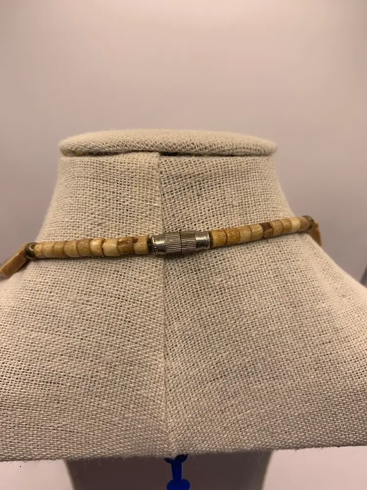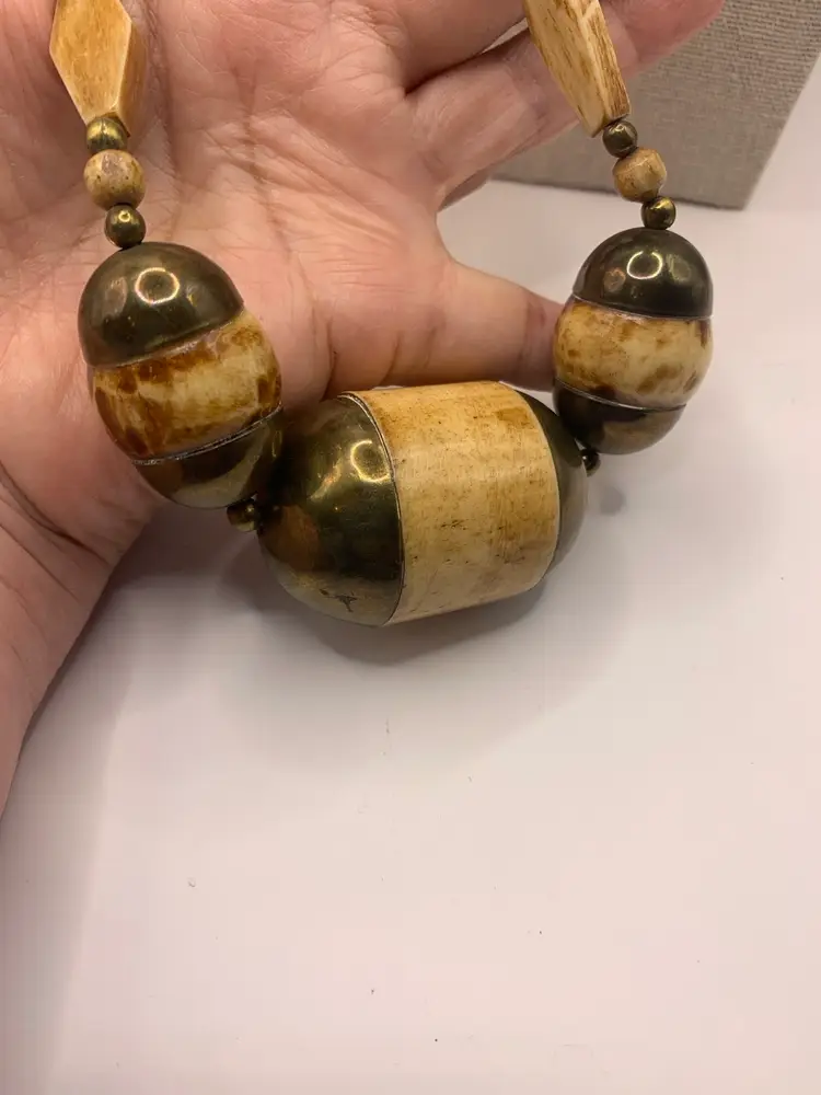 Very unique organic looking piece Barrel beads are ceramic and the elongated beads are made of bone I think Brass tone spacers and end caps on the barrel beads Weighty piece Measures 32 in Barrel clasp Excellent condition