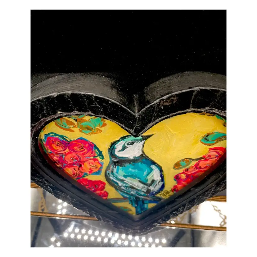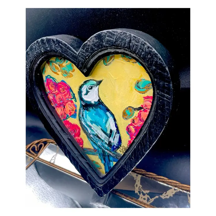 New, original bird painting on watercolor paper in 7.5” x8” preloved heart frame With glass. Good condition #1184