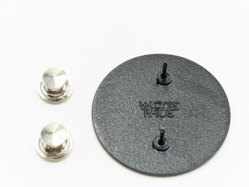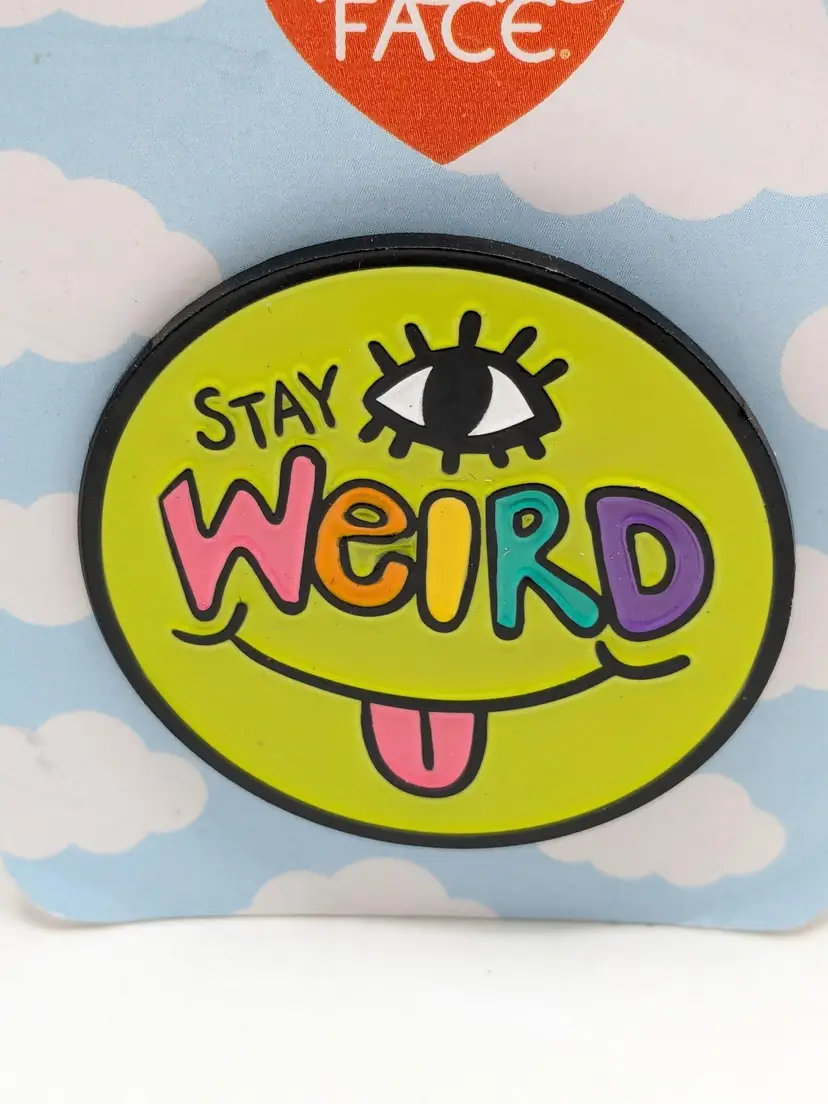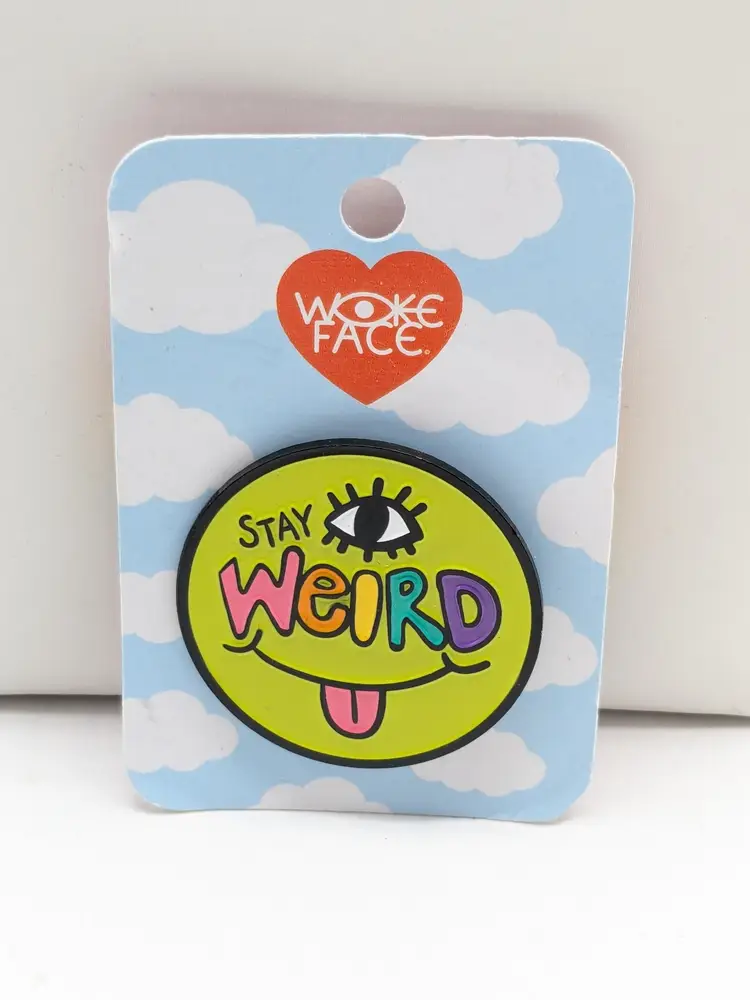 Fun, colorful and quirky pin featuring a bright smiley face with 'Stay Weird' text. Perfect for adding a playful touch to your outfit or bag. Measures 1 1/2". Good condition. By Wokeface. New old stock. EN2