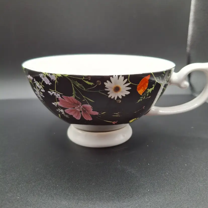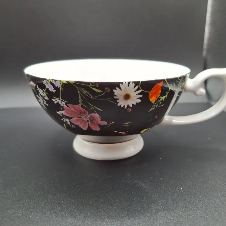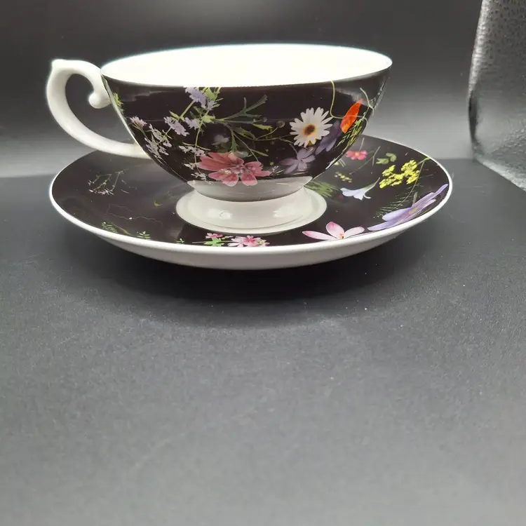 Transport yourself to a tranquil meadow with this elegant black tea cup and saucer set. Adorned with vibrant wildflowers, it combines charm and functionality, perfect for unwinding moments. Crafted from fine bone china, it exudes sophistication while being both microwave and dishwasher safe for modern convenience.