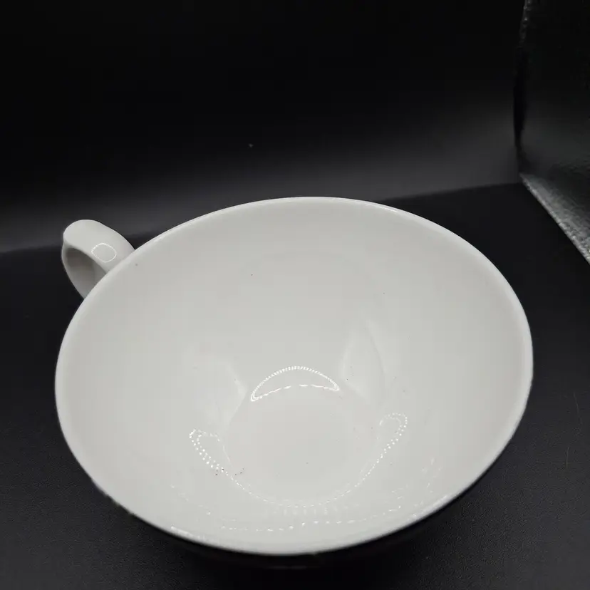 No visible chips, cracks, or scratches. Saucer diameter = 6 inches, cup height = 2.5 inches, cup diameter = 4 inches.