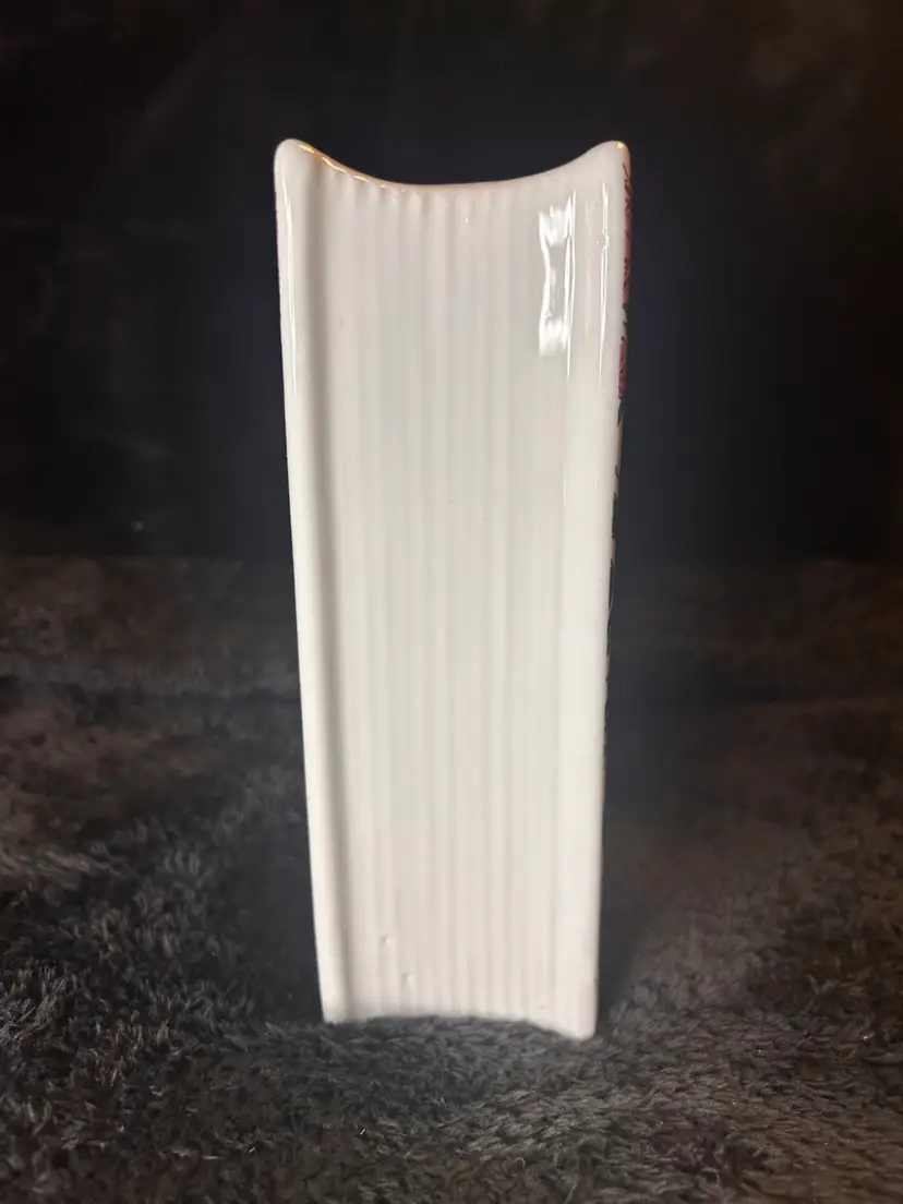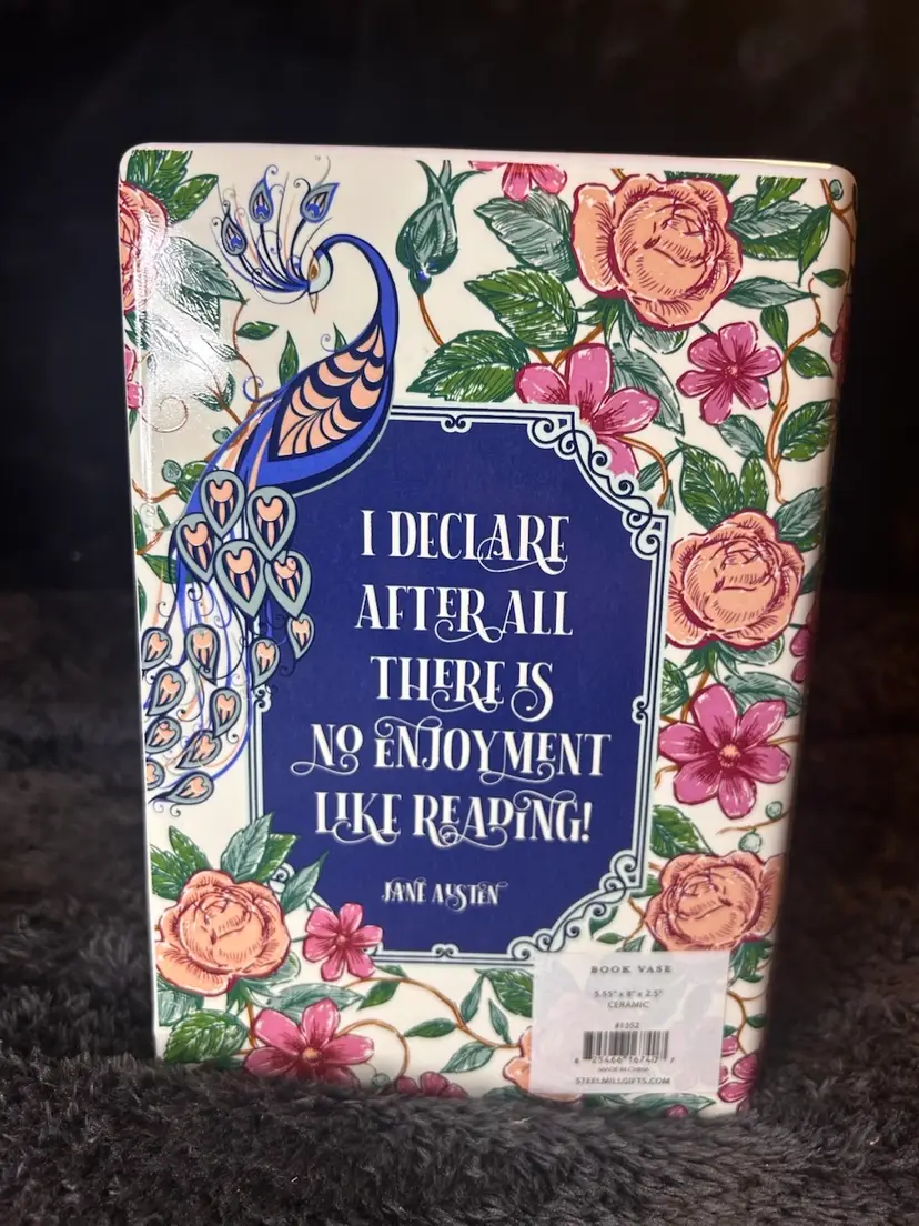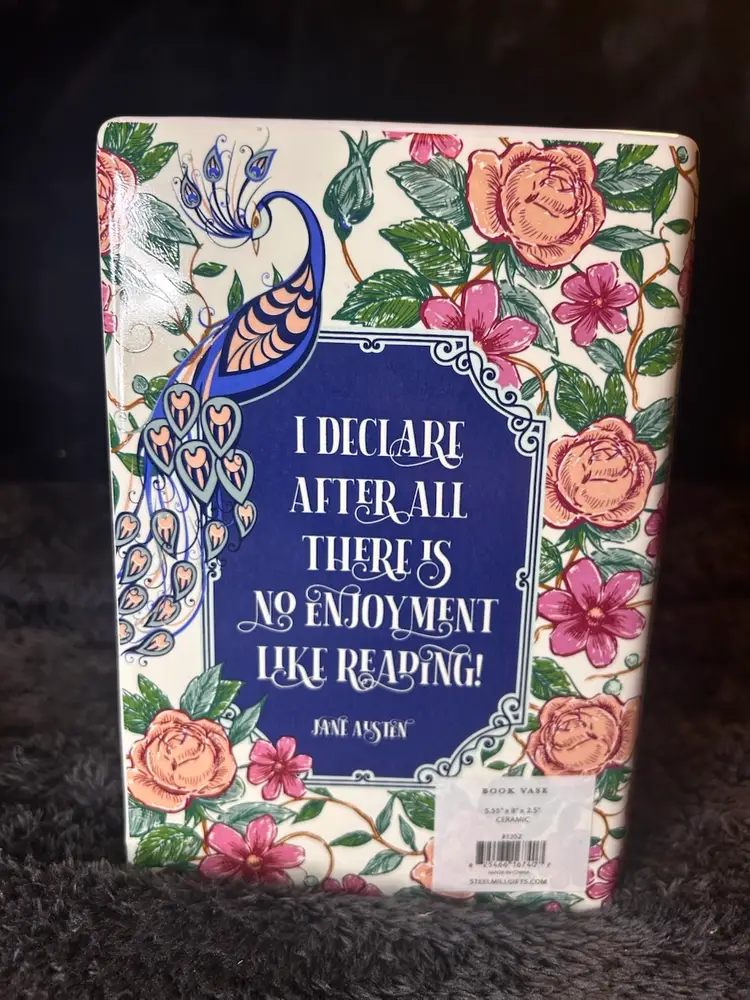 Inspired by Jane Austen's classic novel, this ceramic vase is designed to look like a hardcover book. It features detailed artwork on the cover, including roses and a peacock, and the side is textured to mimic the appearance of stacked pages.