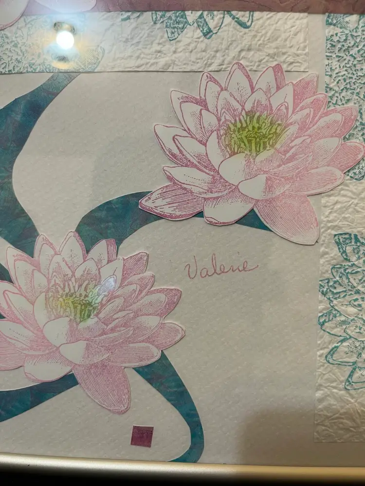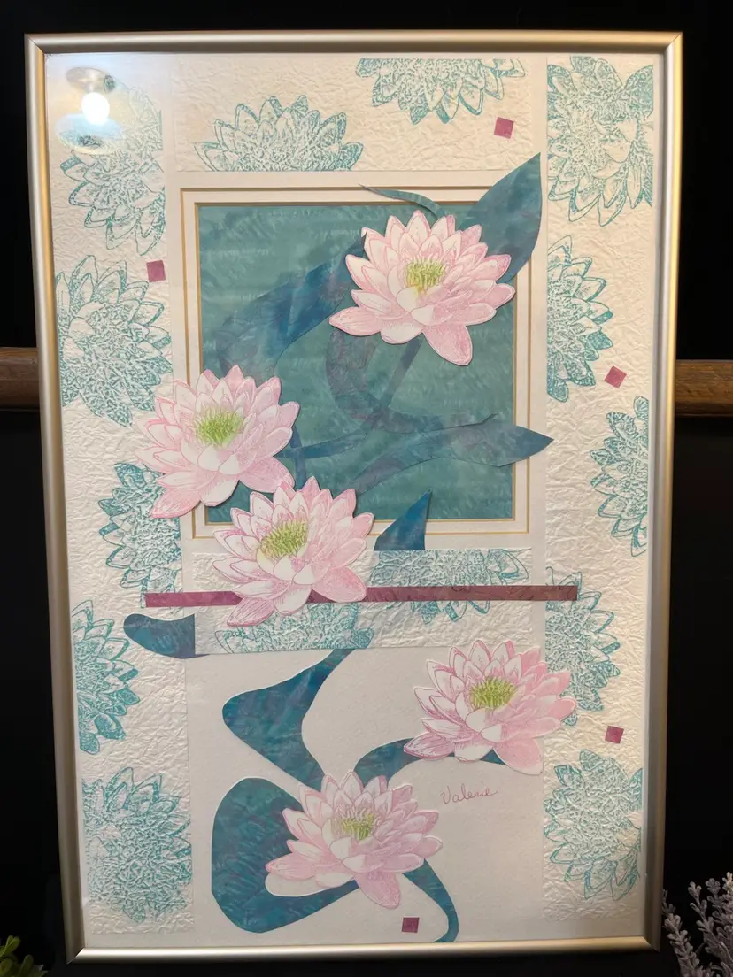 This is in excellent condition. Nicely crafted & framed by Valerie. Would look pretty in a bathroom or bedroom. Measures approx 12" x 18", 3 Lbs