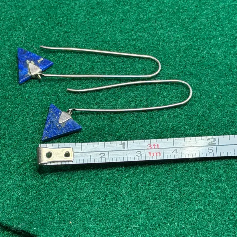 This striking pair of minimalist earrings appear to be artisan made. They are unmarked but tested as sterling silver. They are just over 1-3/4 inches long.