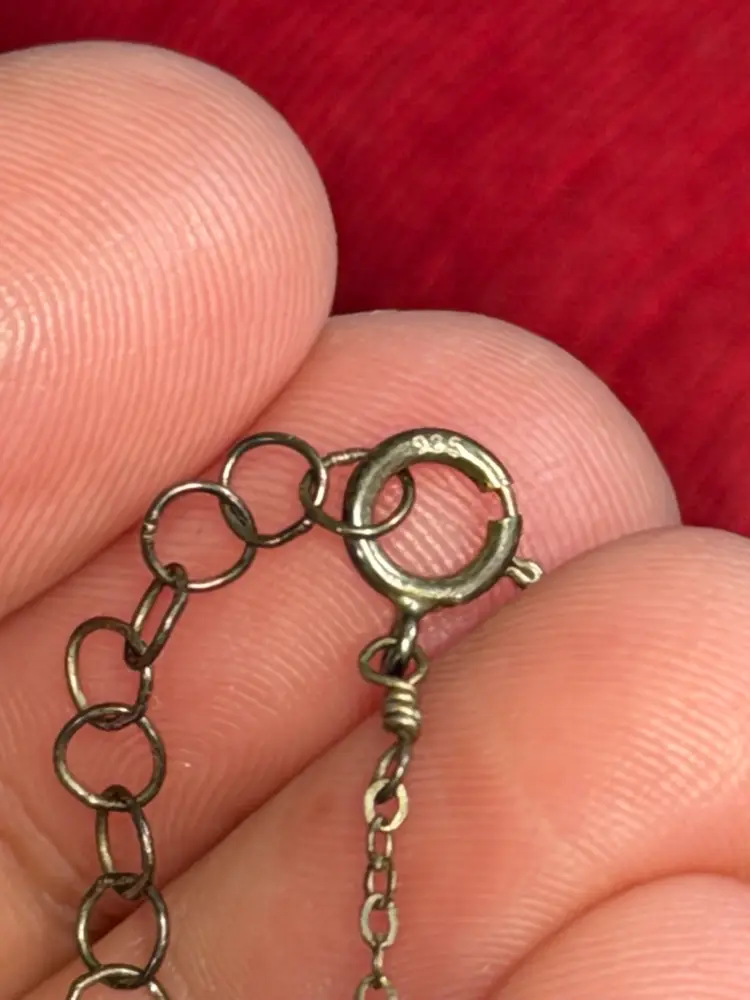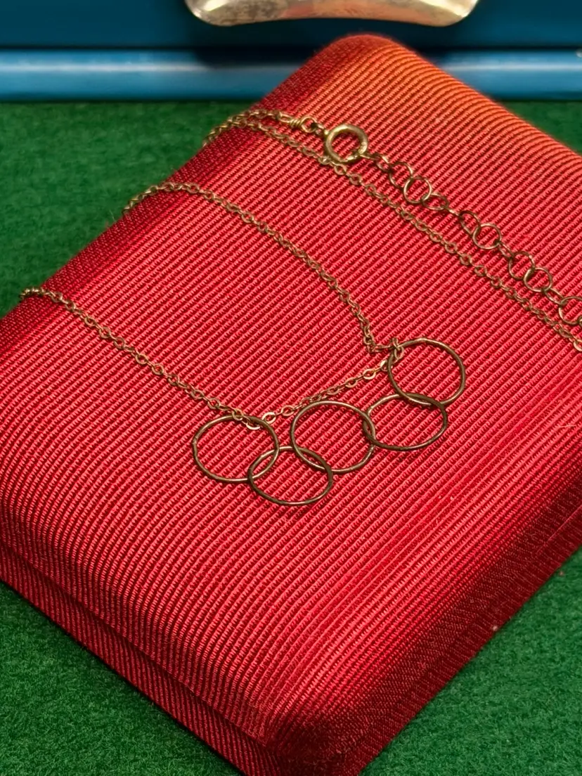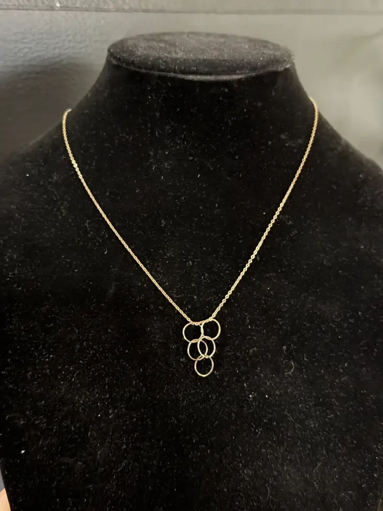 This delicate necklace is tested and marked 925 Sterling silver. The pendant consists of 5 small hoops connected in a chain. The chain is about 18 inches long.