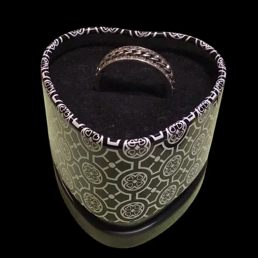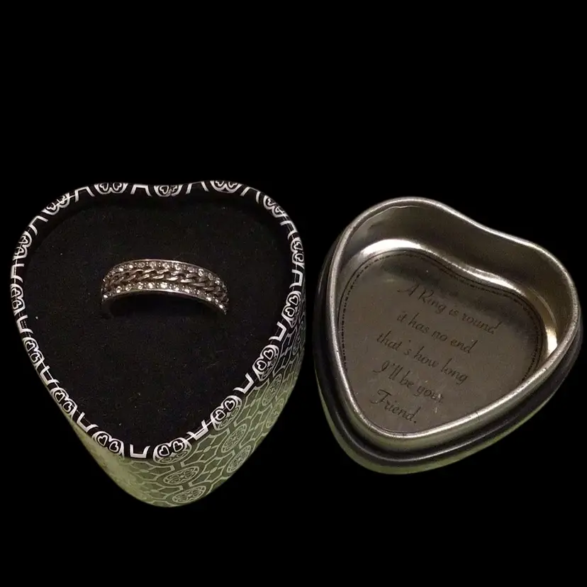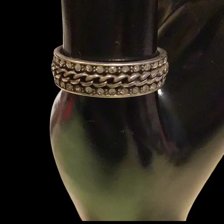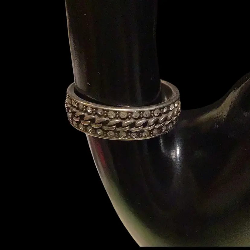 Size 9 new in original metal ring box, marked with script B inside a heart. Has a chain link design lined with rhinestones, tested & confirmed 925. #549