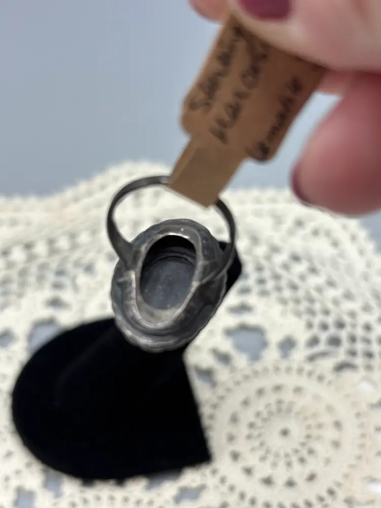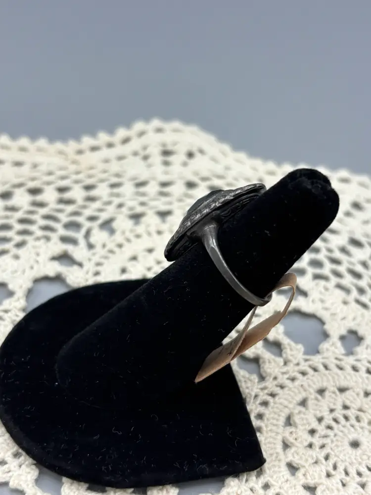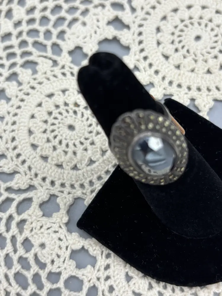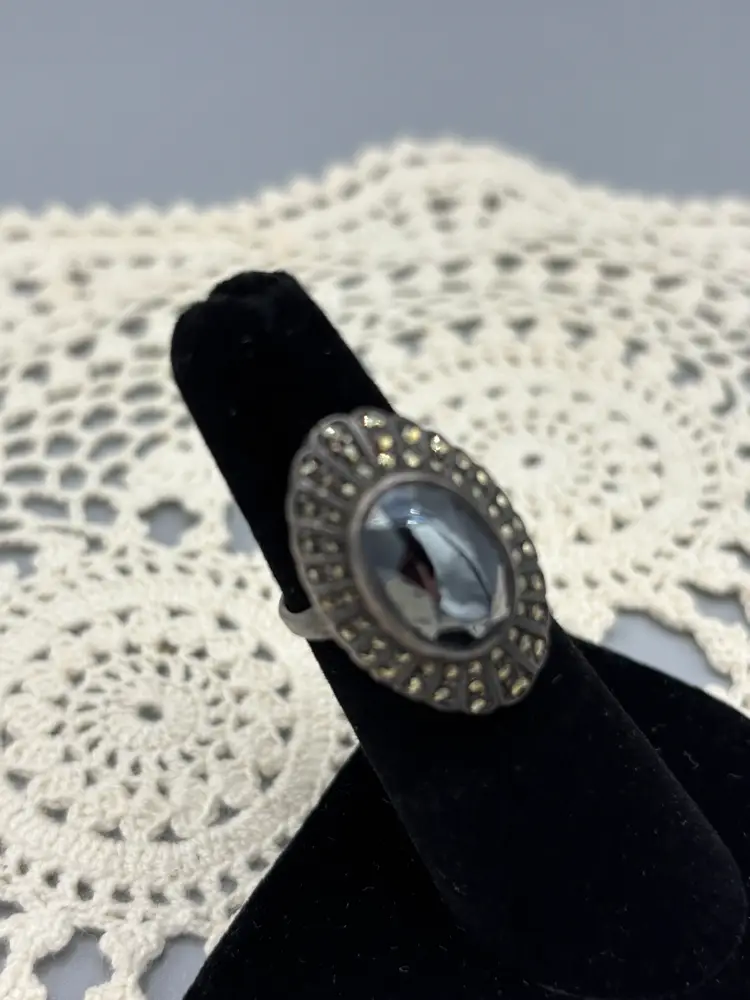 Sterling Marcasite with Hematite stone that is a large statement ring. The details on this ring is outstanding and lovely. size 6