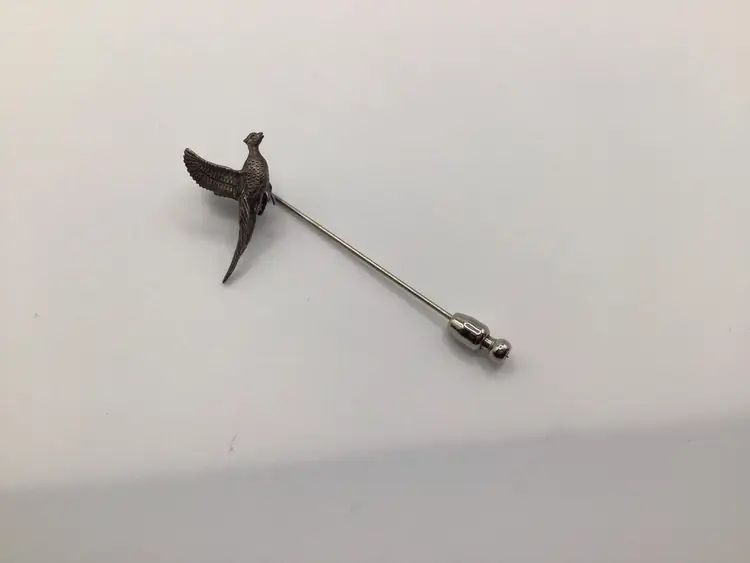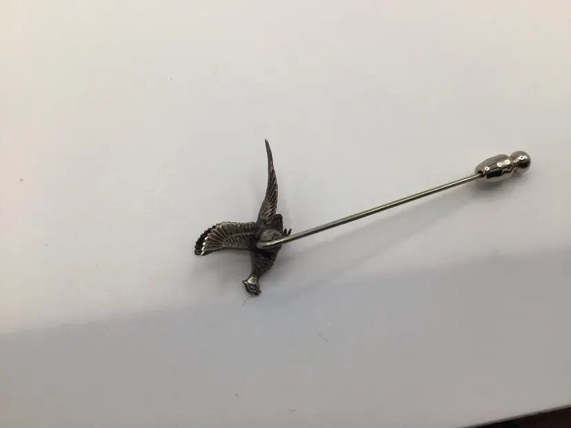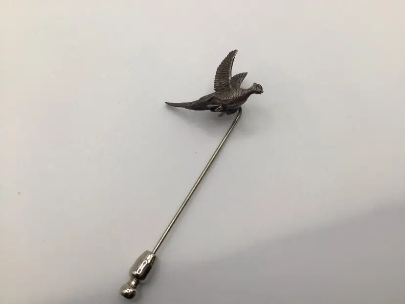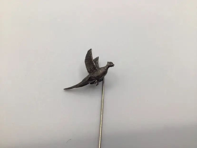 Very nice detailing of pheasant bird in flight. Gun metal grey no markings, It did test positive for sterling. Great gift for the hunter, bird lover. #001