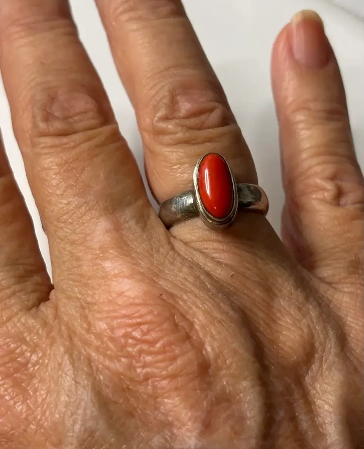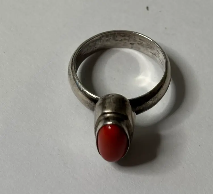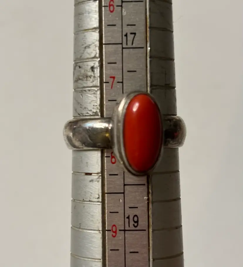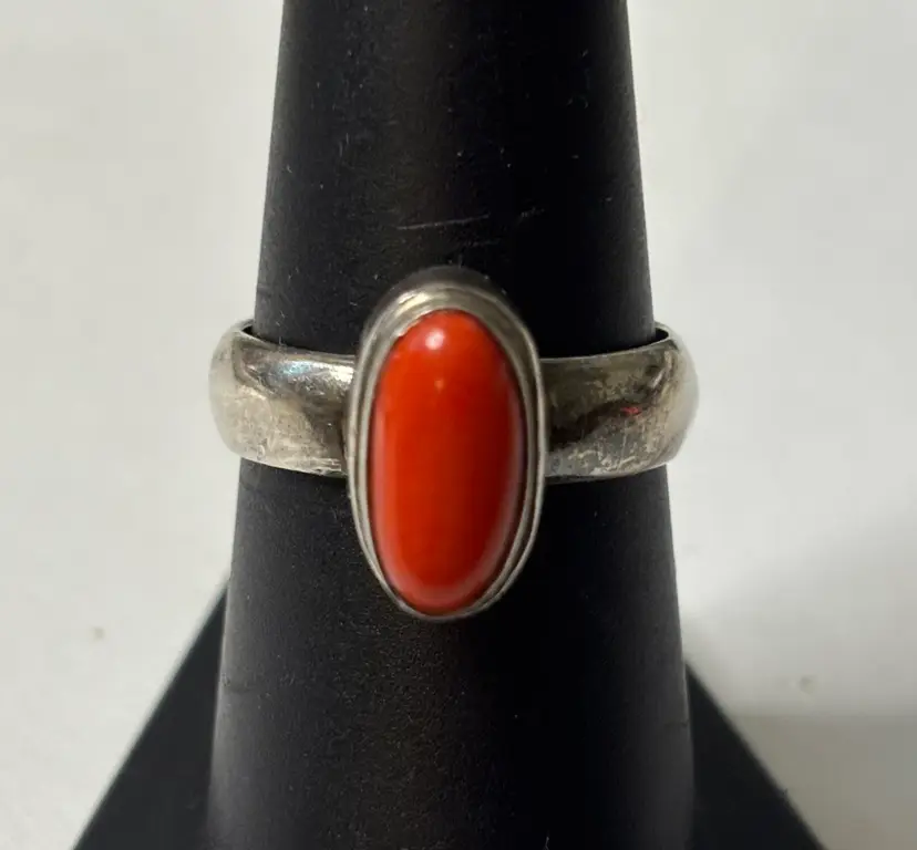 Handsome ring, sits high on the finger. Bezel set oval of coral as your centerpiece. Solid band that is almost a size 8. Unmarked, but tests positive for sterling.