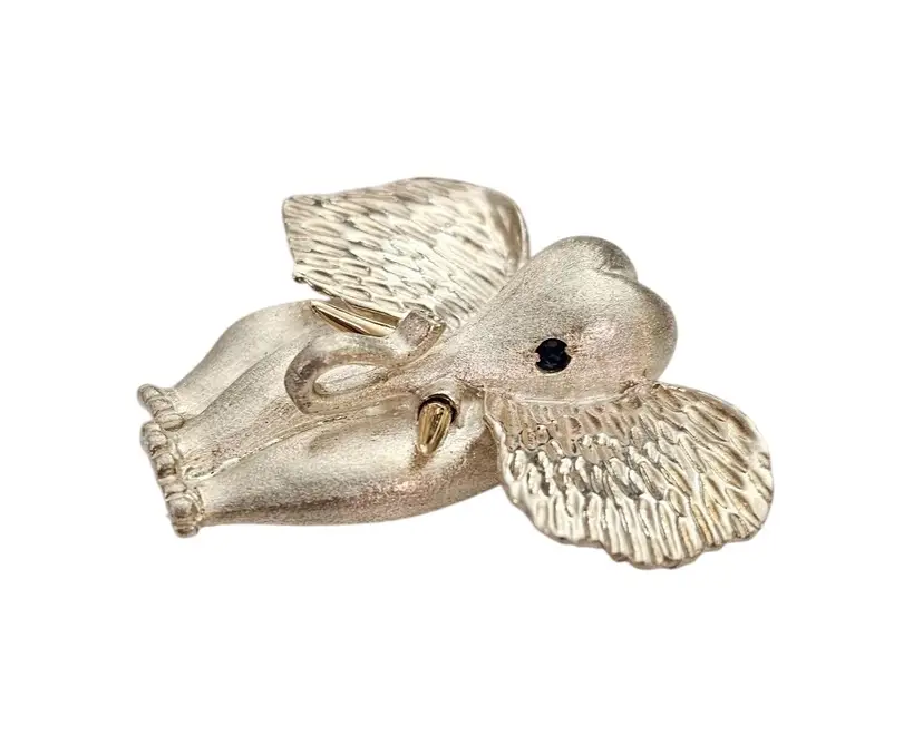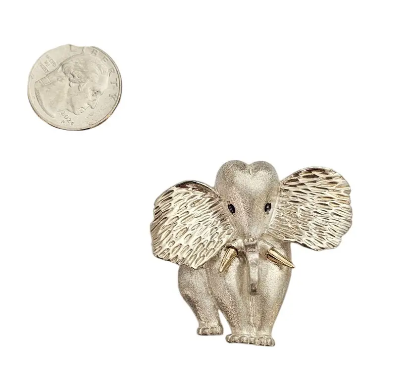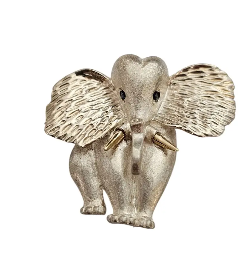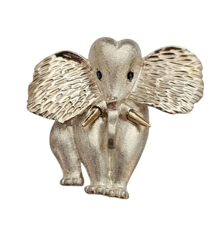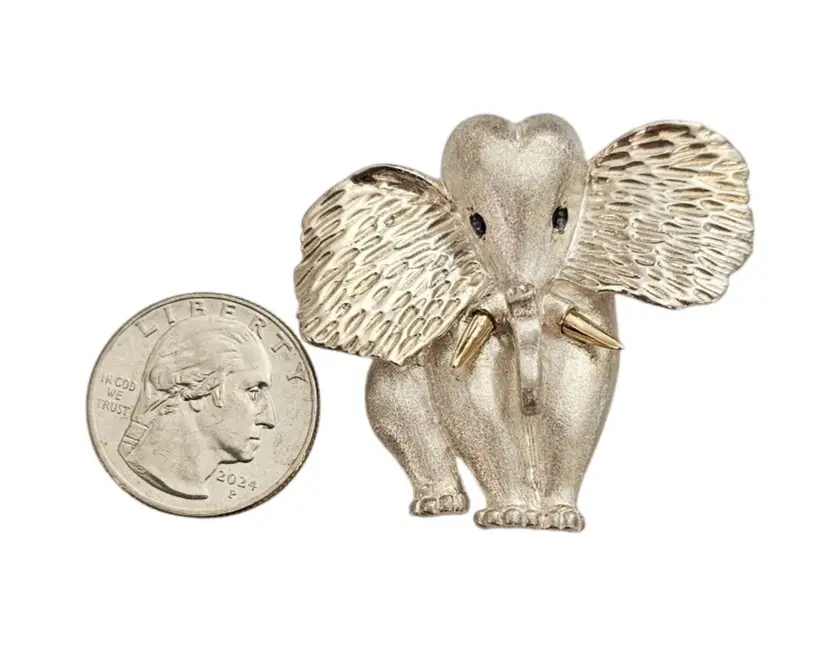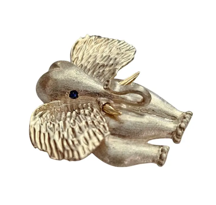 • Sterling Silver 14K Elephant Brooch • Vintage costume jewelry • Intricately detailed Elephant figural • Grooved ears, brushed finish body with a smooth, highly polished gold tusks • Sterling silver base metal • Accented or layered with genuine 14-karat gold • Blue stone set in the Elephant's eyes • It measures approximately 1.9 inches at its widest and 1.7 inches in height • The back has a straight pin mechanism with a rollover safety clasp, which can be firmly attached to your clothing • Good condition • C242