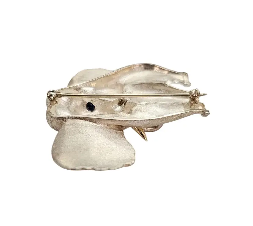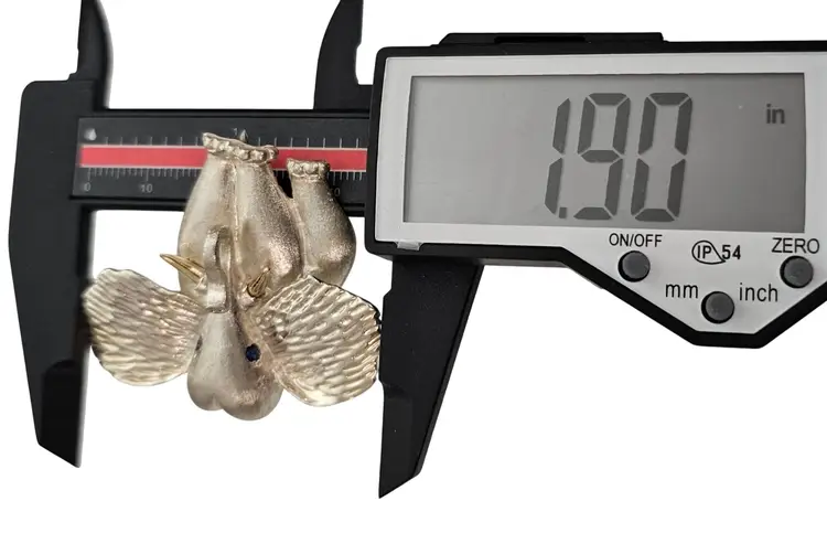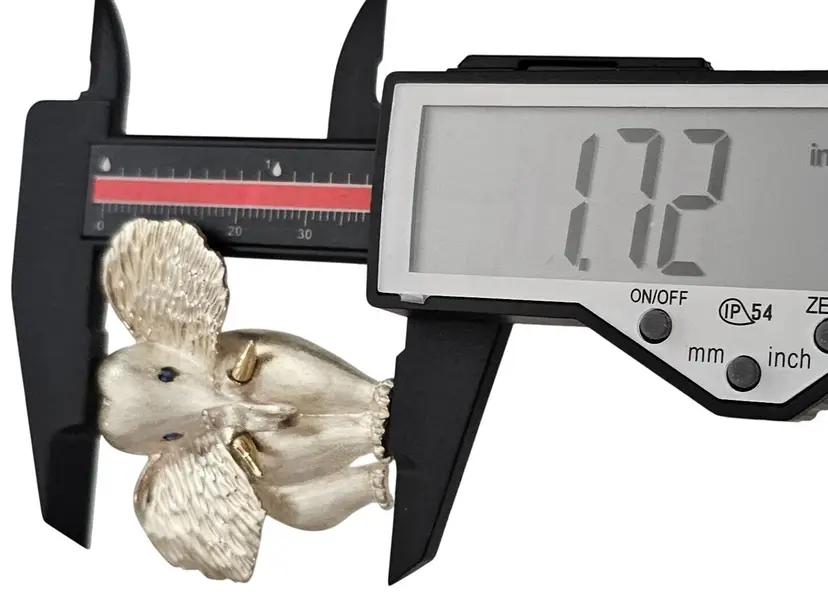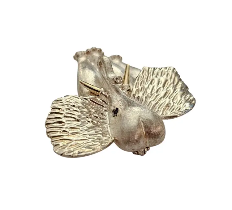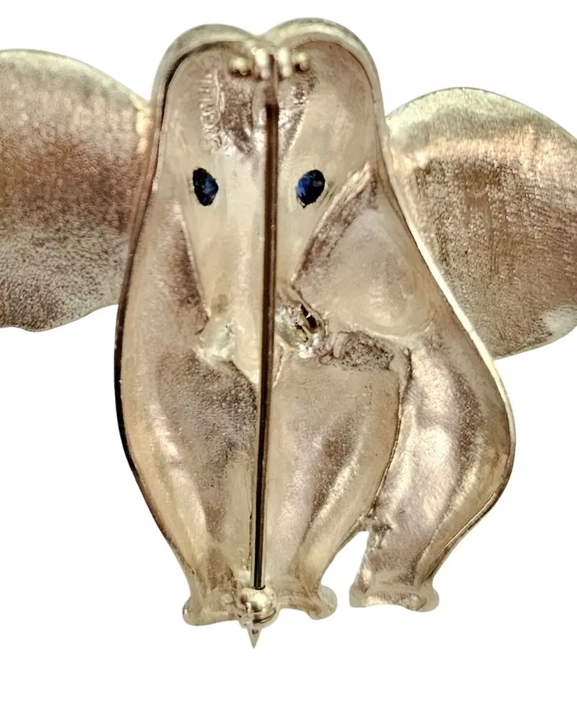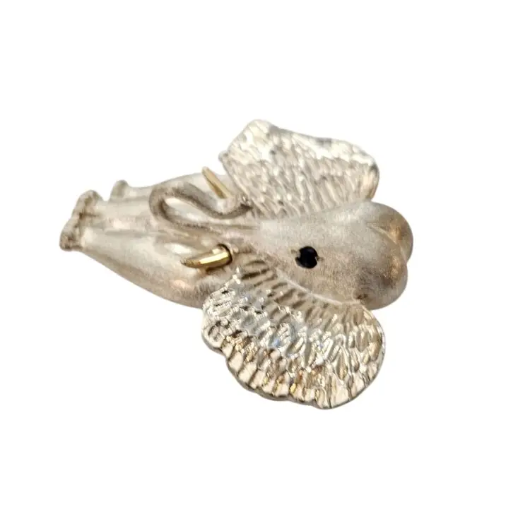 • Sterling Silver 14K Elephant Brooch • Vintage costume jewelry • Intricately detailed Elephant figural • Grooved ears, brushed finish body with a smooth, highly polished gold tusks • Sterling silver base metal • Accented or layered with genuine 14-karat gold • Blue stone set in the Elephant's eyes • It measures approximately 1.9 inches at its widest and 1.7 inches in height • The back has a straight pin mechanism with a rollover safety clasp, which can be firmly attached to your clothing • Good condition • C242