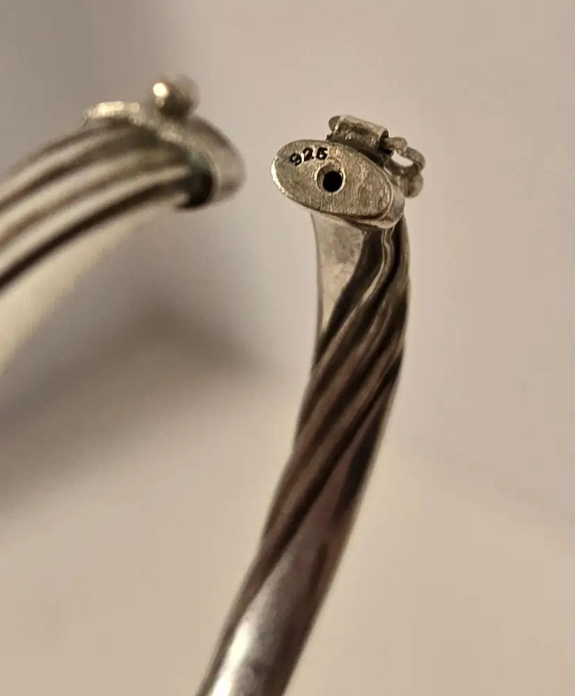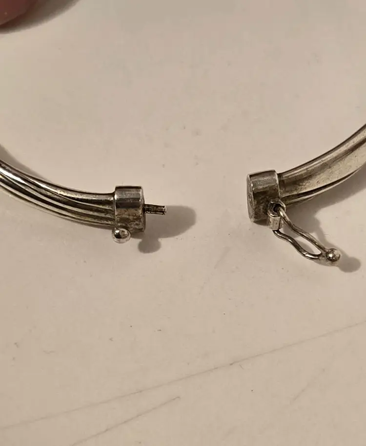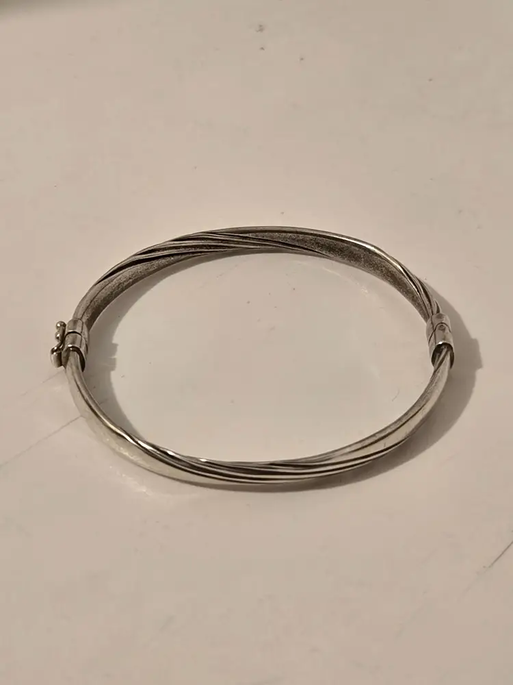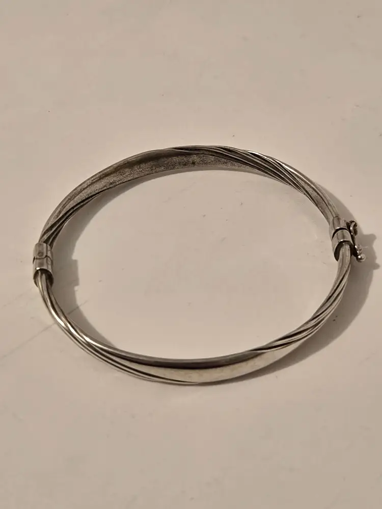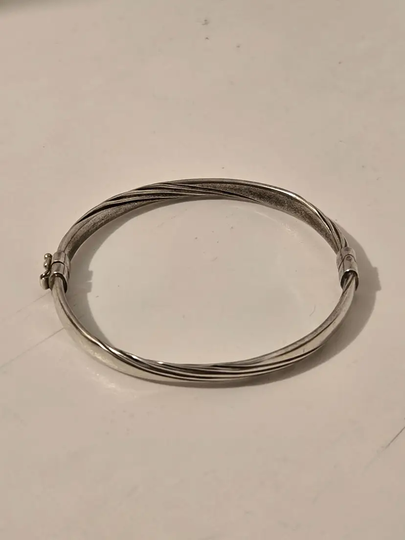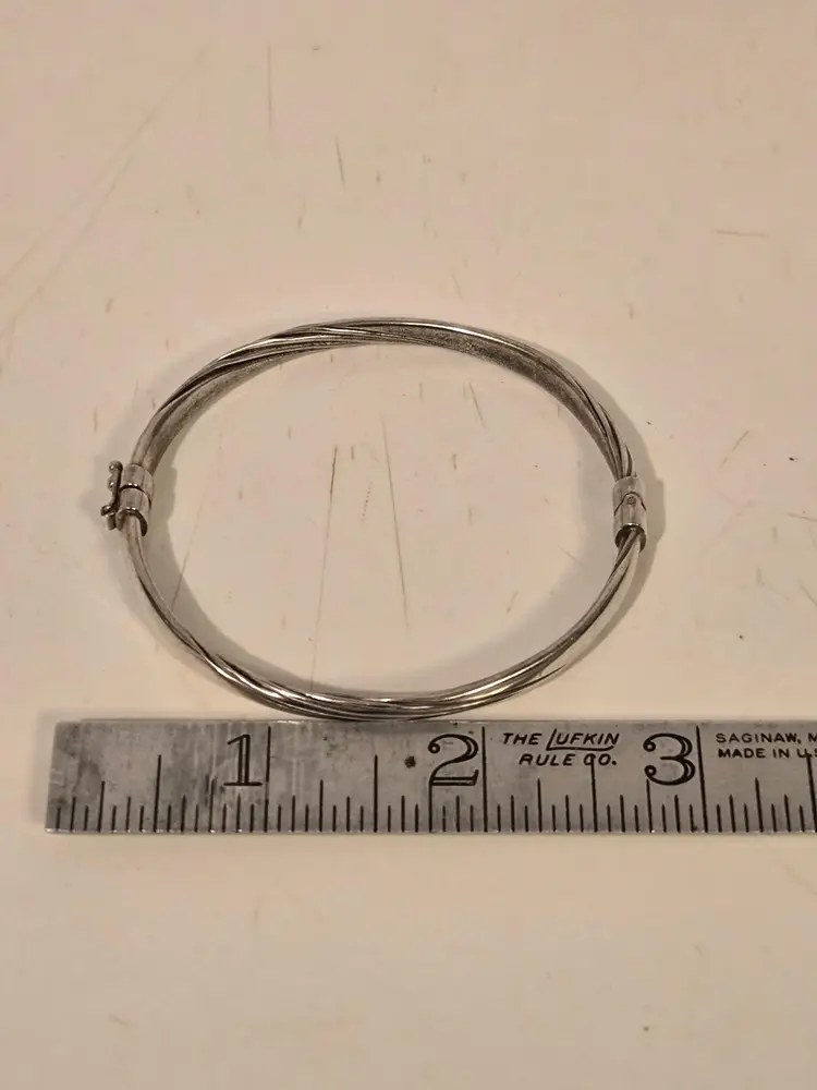 This beautiful and simply designed sterling silver bangle bracelet measures approximately 7 inches inside. It is hinged and is in good used condition.