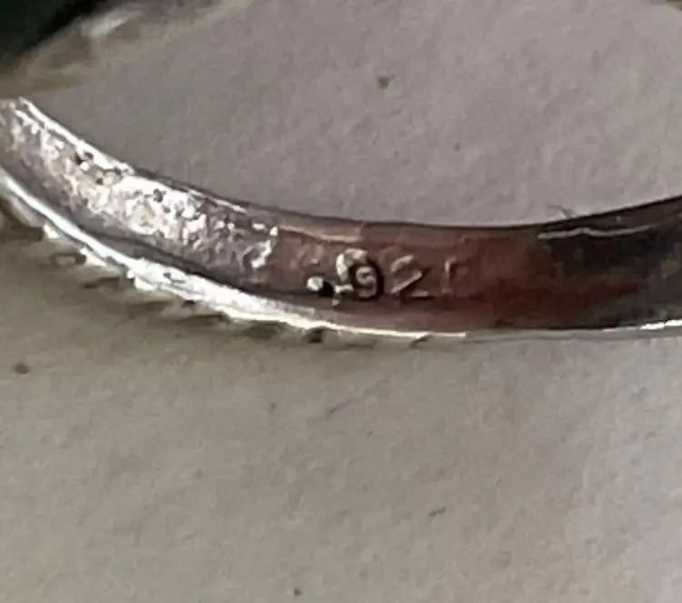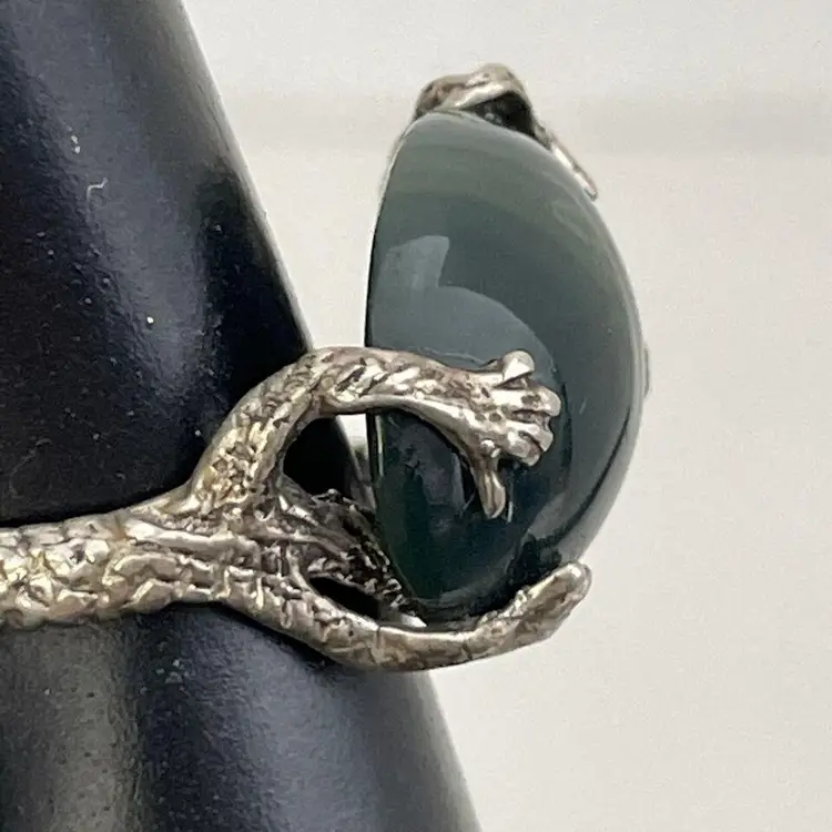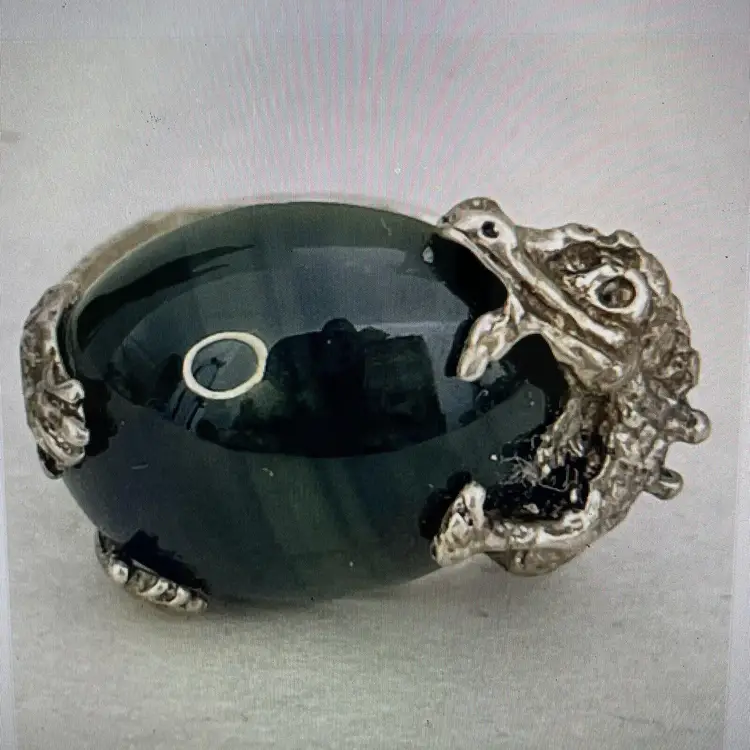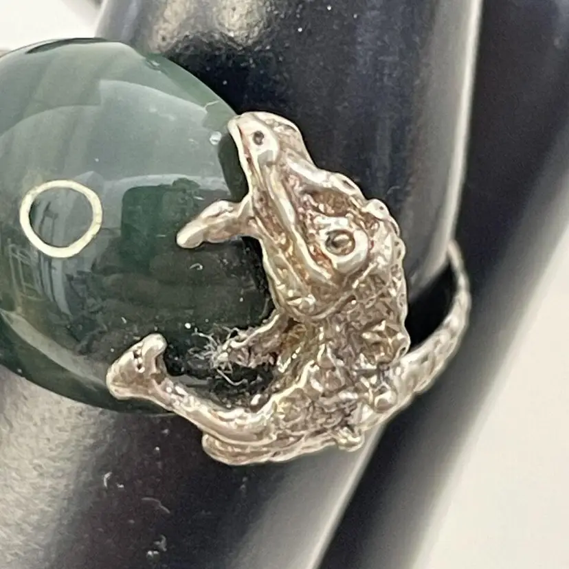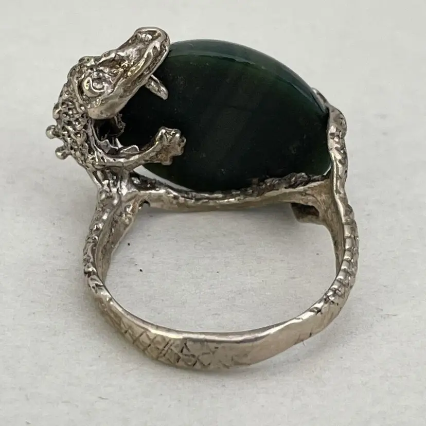 This stunning dragon ring is crafted from sterling silver (.925) and features a deep green jadite stone. The intricate design of the dragon adds a touch of fairytale and fantasy to any outfit. This one-of-a-kind piece is a size 6-3/4 and sure to make a statement. The ring is perfect for those who love unique fashion jewelry and is sure to become a cherished addition to any jewelry collection. The jadite stone adds a pop of vibrant color and the sterling silver ensures its durability for everyday wear. No box.
