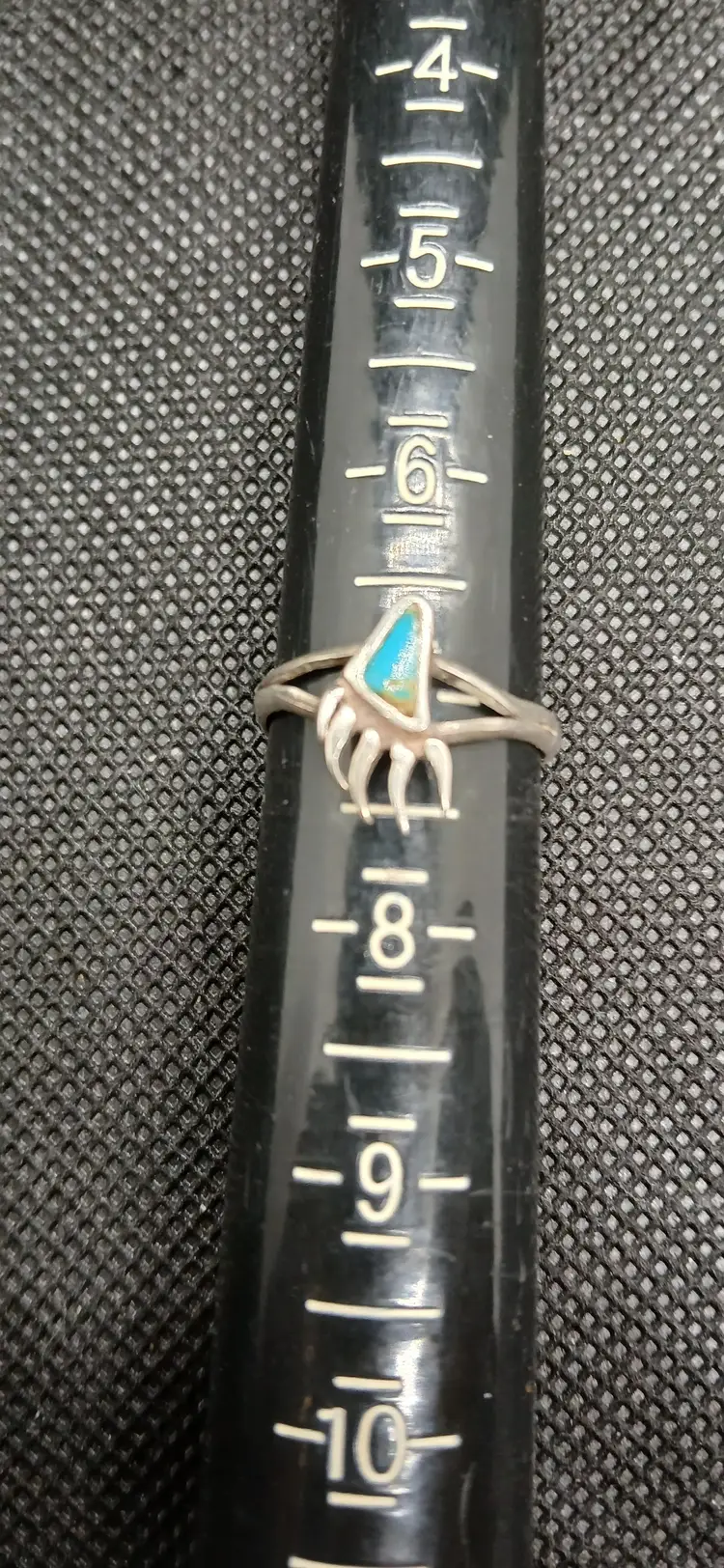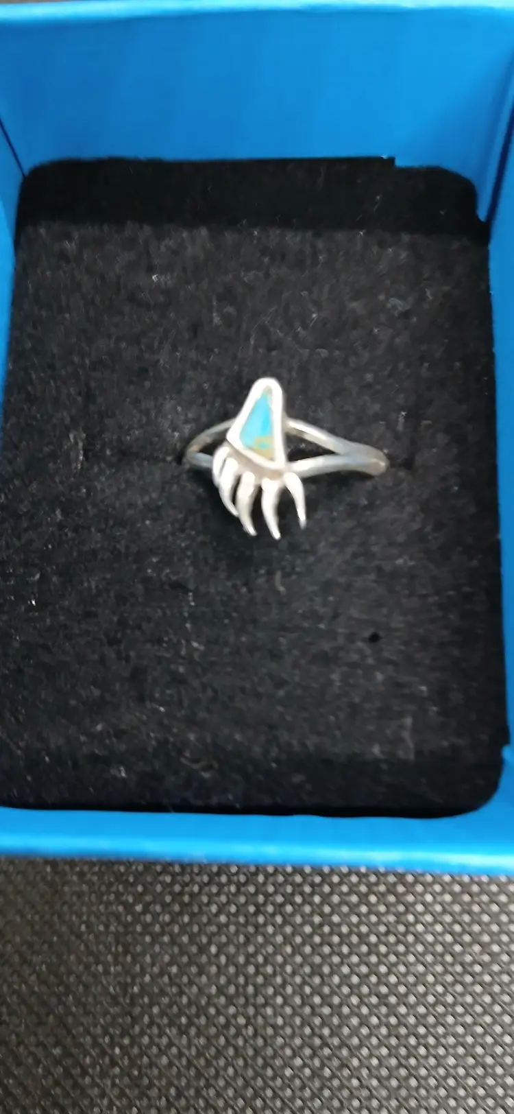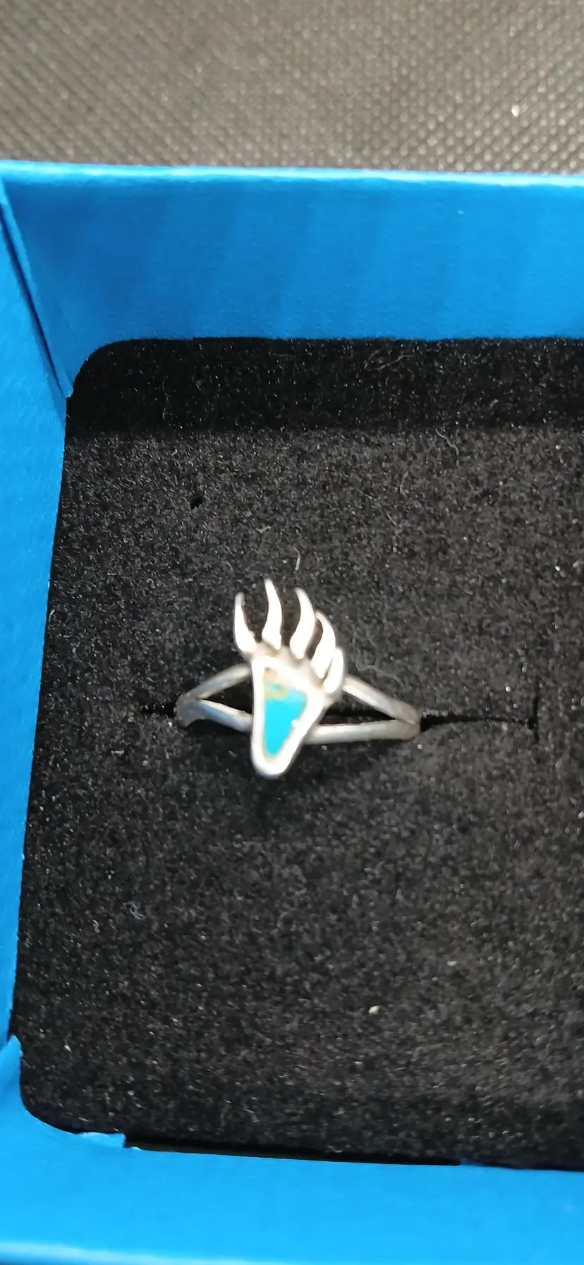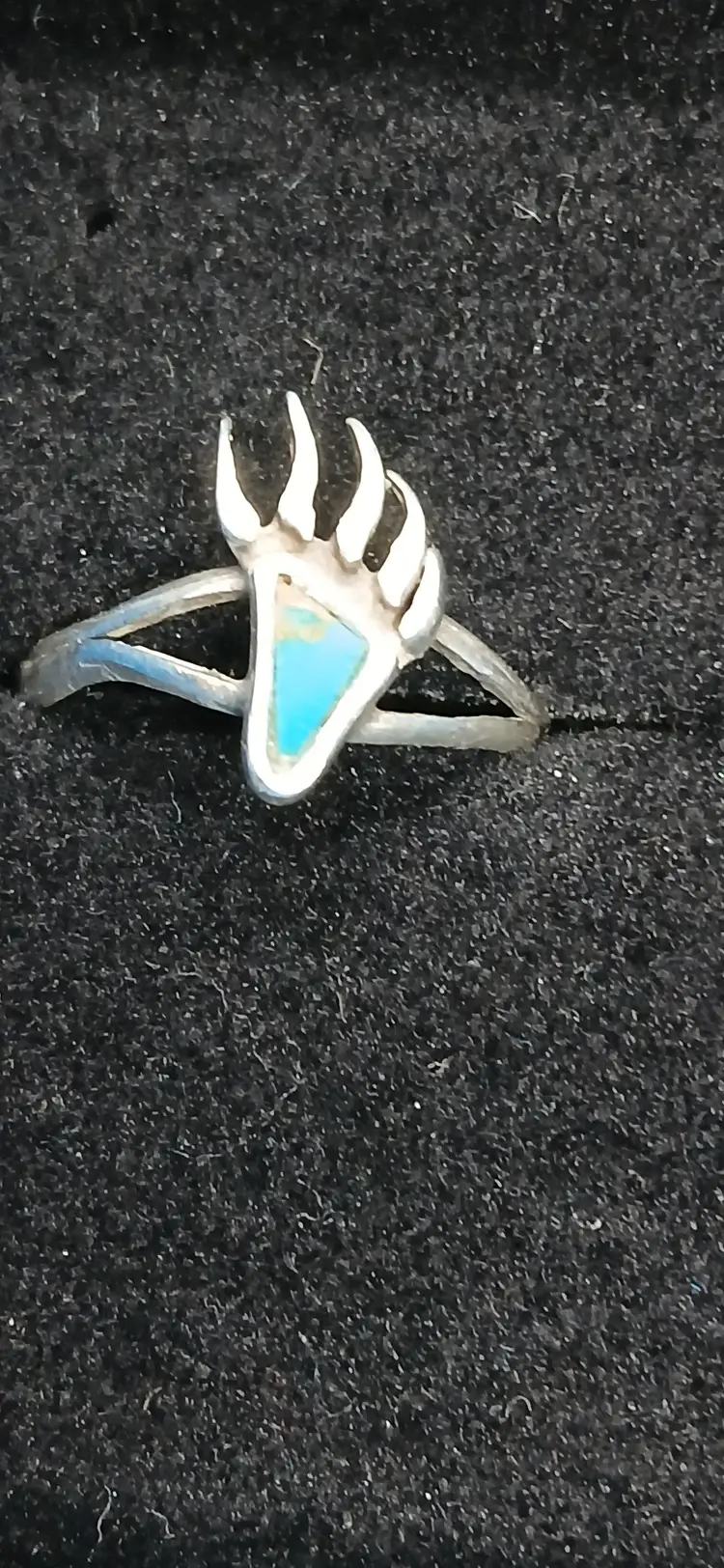 This unique sterling silver ring features a striking bear paw design with a beautiful turquoise inlay. Most likely made by Zuni Tribe. Perfect for anyone who loves nature-inspired jewelry or wants to add a touch of the Southwest to their collection. The bear paw symbolizes strength and courage, making this ring not just a stylish accessory but also a meaningful piece. Don't miss out on this one-of-a-kind find! Size 7 see pics for actual ring size.
