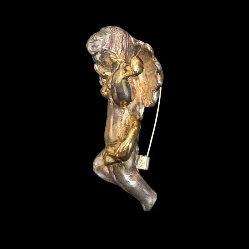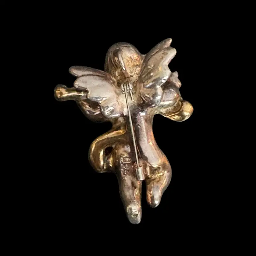 This sweet cherub can be worn as a pin or pendant. It is marked 925 and has a gold wash over the violin and ribbon surrounding him. It is approximately 2 1/2” high and 1 3/4 at its widest point. This weighs 16 grams. He is sterling silver.