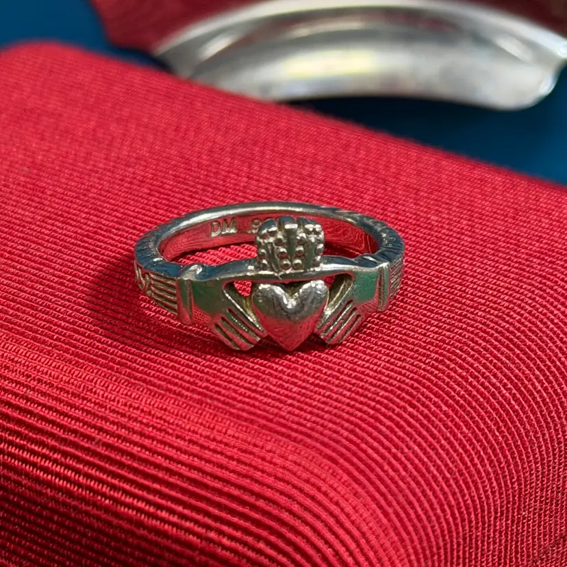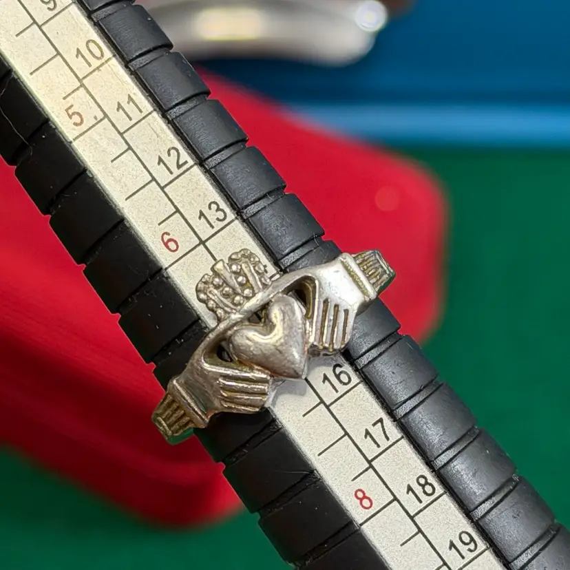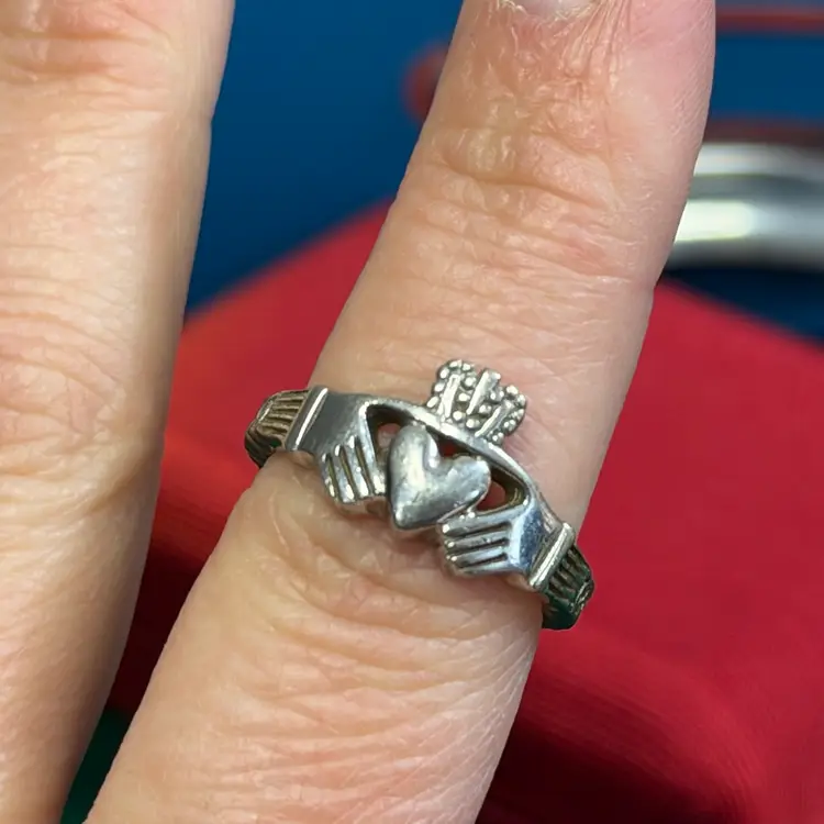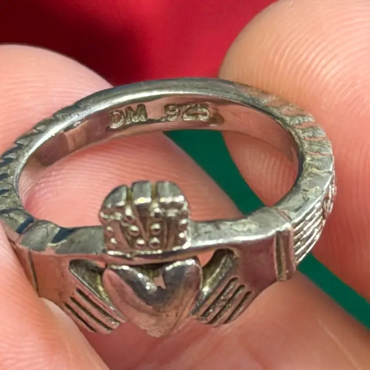 This lovely Sterling claggdah ring is an excellent example of the Irish tradition. The hands holding the heart out indicates that the wearer is open to a new relationship and love. The hands holding the heart towards the wearer indicates their heart is taken and they are in a committed relationship. These rings were also commonly worn as wedding rings. This ring was confirmed sterling with an acid test and is US size 7.
