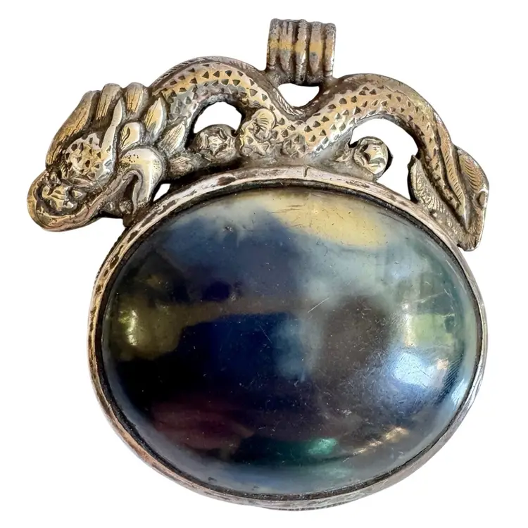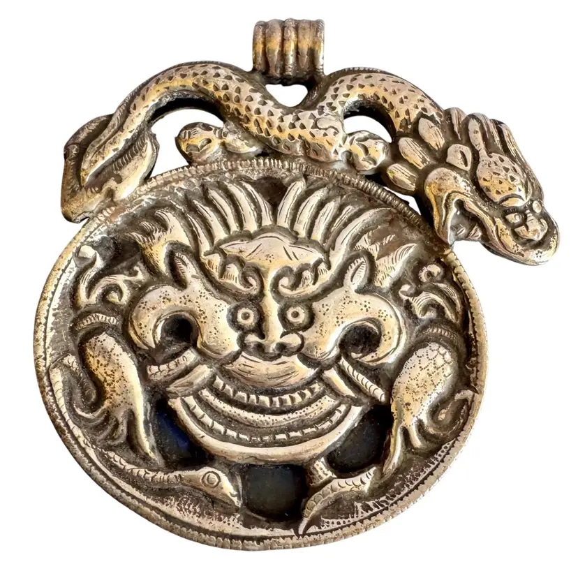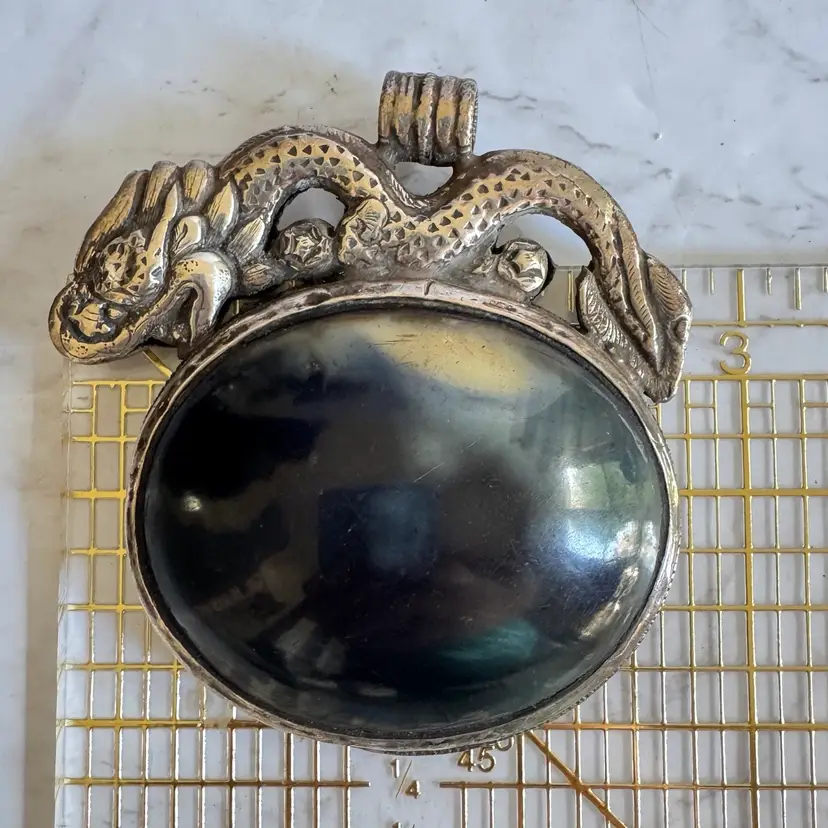 This striking pendant features a detailed dragon design, symbolizing guardianship and power in Buddhist tradition, with an oval black agate cabochon at its center. The agate, with its cream variation against a dark base, represents strength and balance, often used in Himalayan jewelry for protection against negativity. Handcrafted with intricate detailing, likely from a mid-19th to early 20th-century Himalayan workshop, this piece serves as both a decorative necklace focal point and a spiritual amulet. Perfect for collectors or those seeking cultural artifacts.