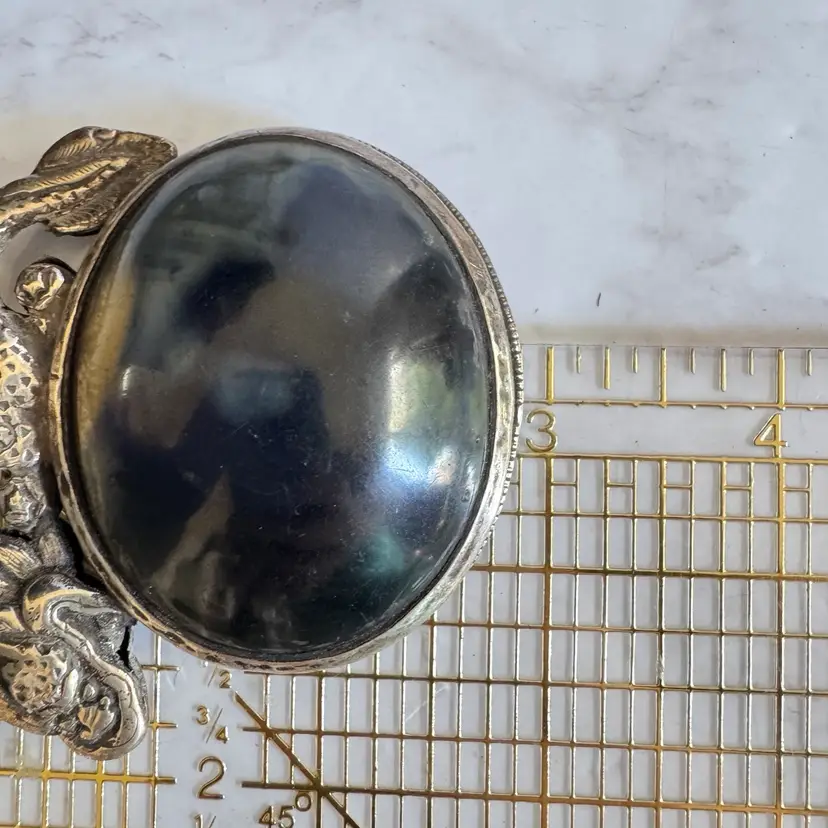 Tested as sterling silver or higher. Good condition with signs of wear due to age. Stone may have natural flaws or cracks. 2-7/8”h x 2-3/4”w. Weighs 54g.
