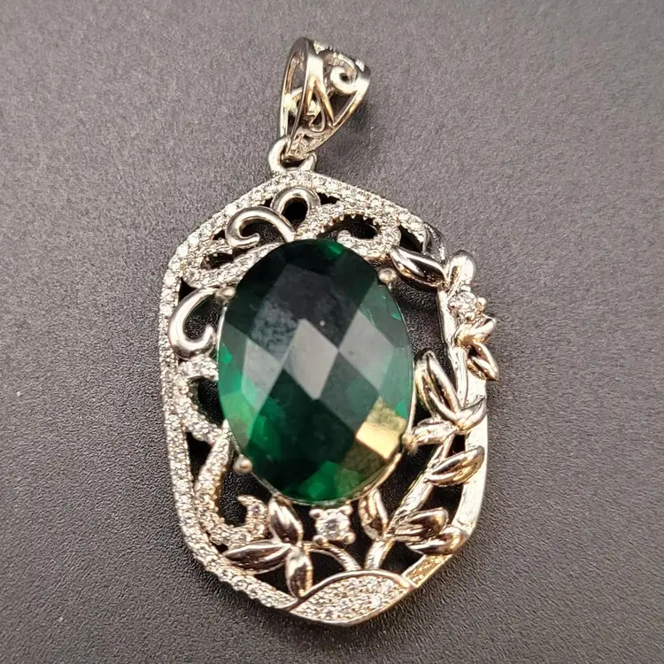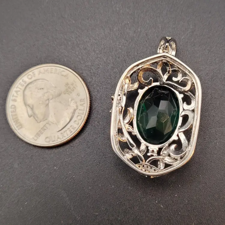 Stunning vintage pendant featuring a large emerald green gemstone set in an intricate silver-tone filigree design. Perfect for adding a touch of elegance and vintage charm to any outfit. Measures approximately 2 inches in length. 💝 All items are packaged with care to ensure safe delivery. #nosadmail ✴️ Follow my Facebook page & IG for more curated vintage treasures! ⚡️ #MrEccentrics #vintagecurator #vintagestyle