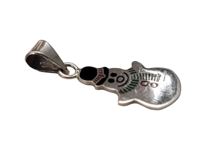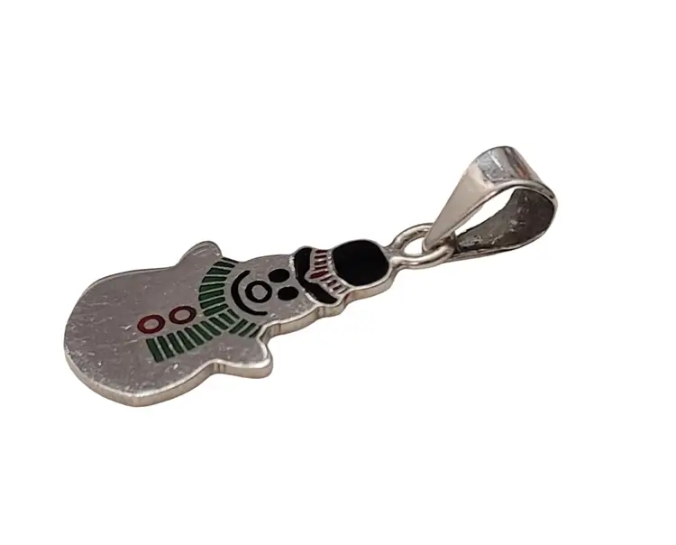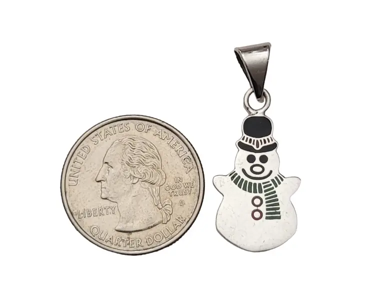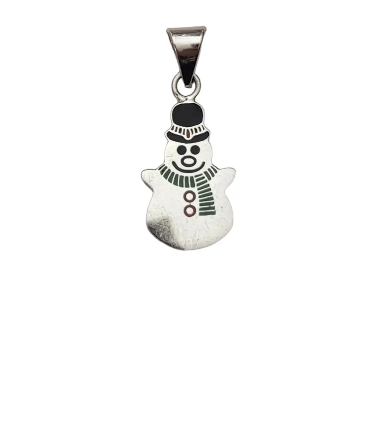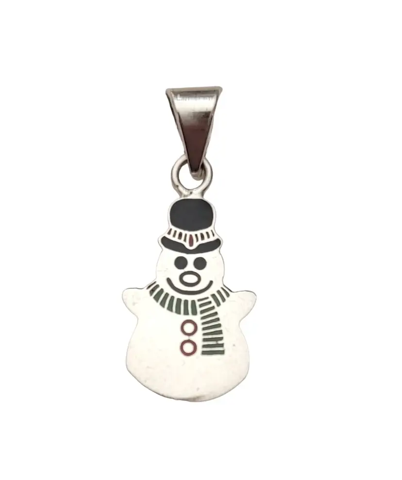 This fun and seasonal Sterling Silver Snowman Pendant makes a delightful addition to your Christmas-themed costume jewelry. It features a lovely Snowman crafted from high-quality sterling silver and is beautifully enameled with black and white, with red and green accents that will bring a touch of winter whimsy to any outfit. It measures approximately 1.5 inches in length. The bale is marked 925, affirming the silver metal purity content on this piece. Add some festive charm to your favorite chain necklace, for a touch of winter magic to your ensemble.