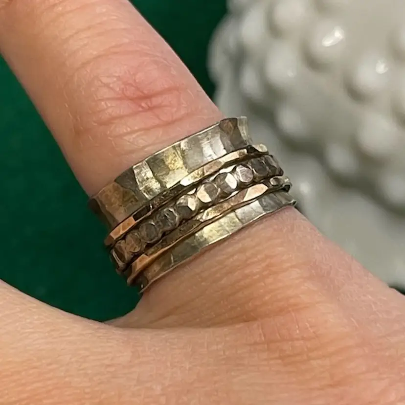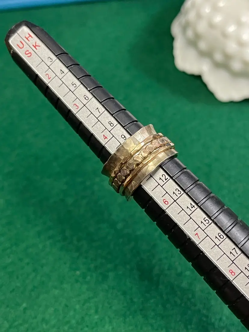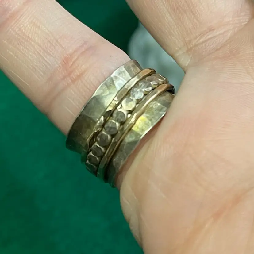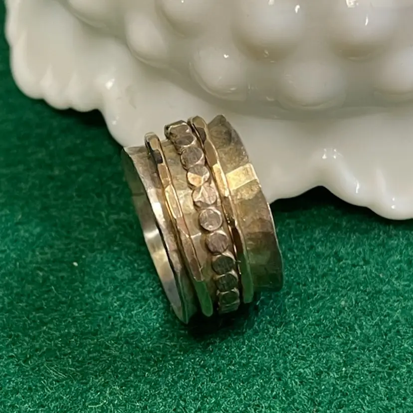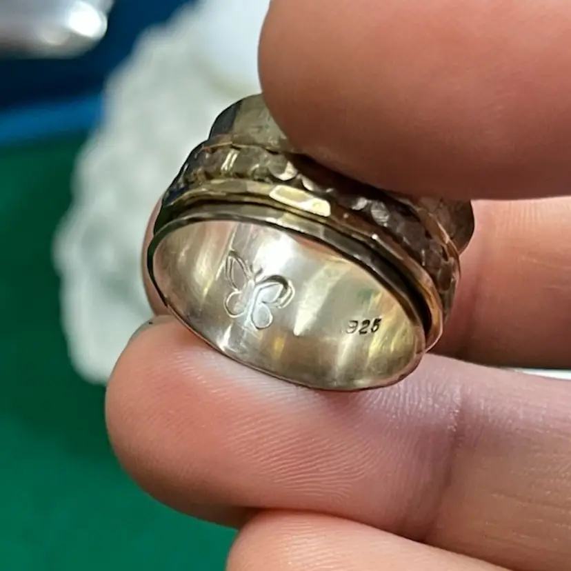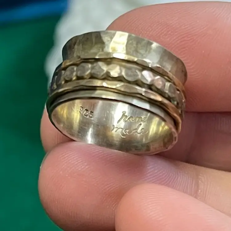 This ring is in great condition. It is signed by the artist as well as marked 925. This was tested and confirmed for the large base ring and the central spinning ring. The gold tone spinning rings test positive for gold but it is unknown if they are solid or plate. The ring is approximately standard US size 5. It weighs 7.39 grams.