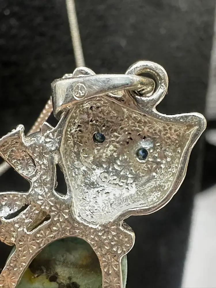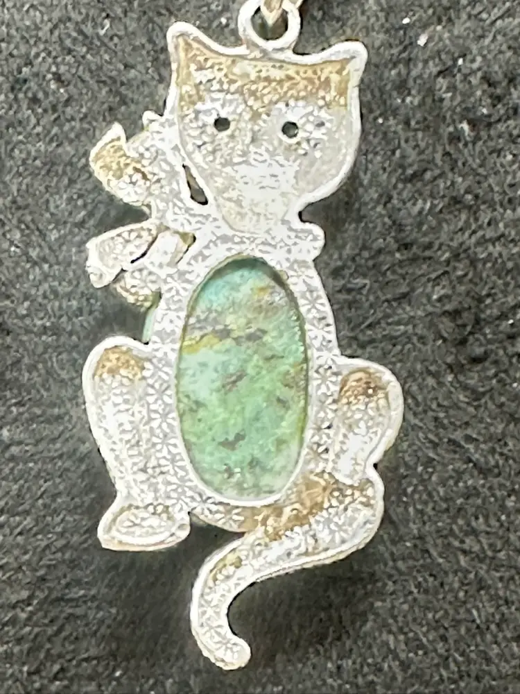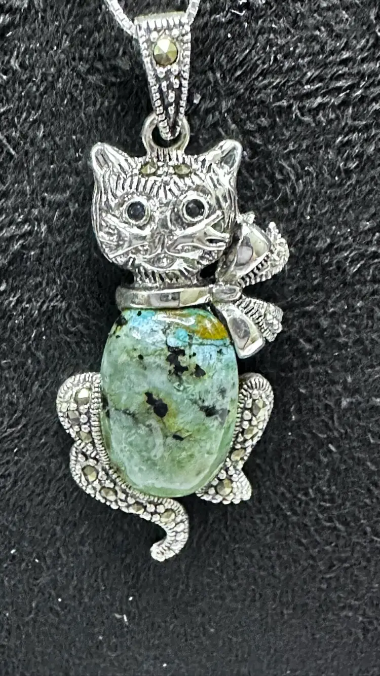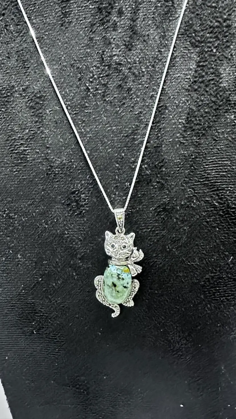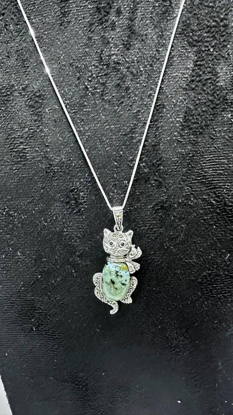 Sterling Silver Gemstone Belly Tourmaline/Tanzanite Cat Pendant & 18 inch Sterling Silver Box Chain Blue Glass eyes Acid Tested and confirmed Silver