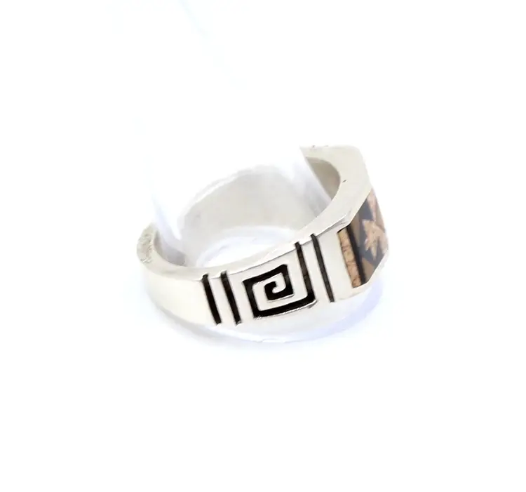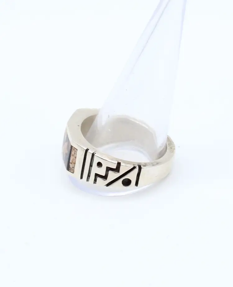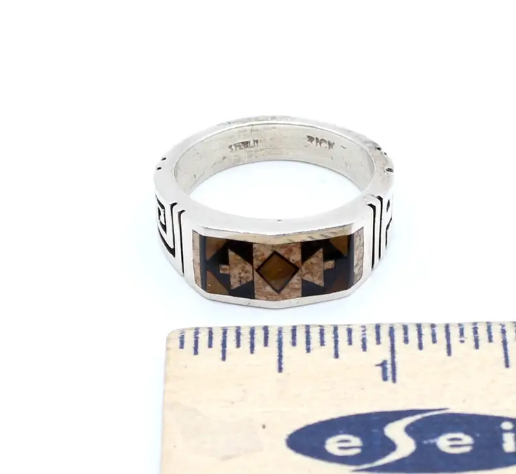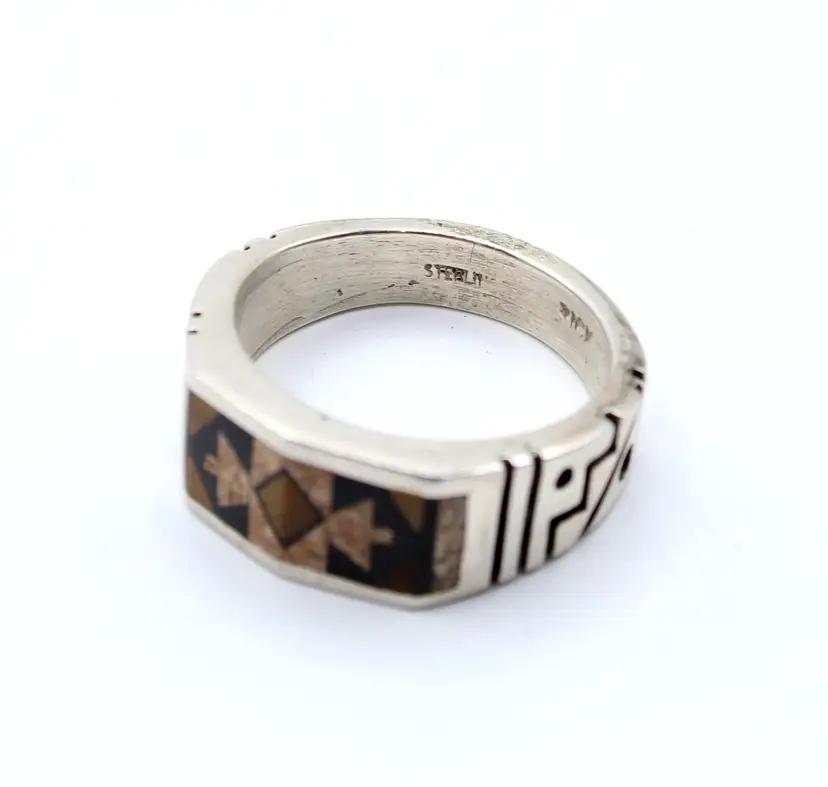 Signed Rick unknown artist. Inlay appears to be Jasper or agate and tigers eye inlay with the southwest arrow design. Greek key design on 6mm band.