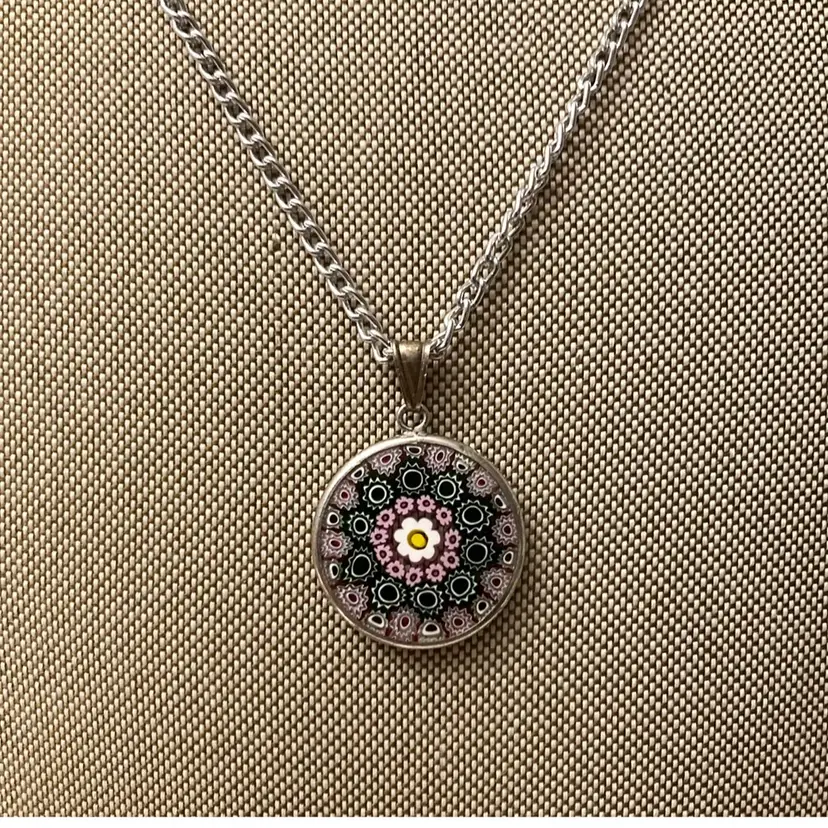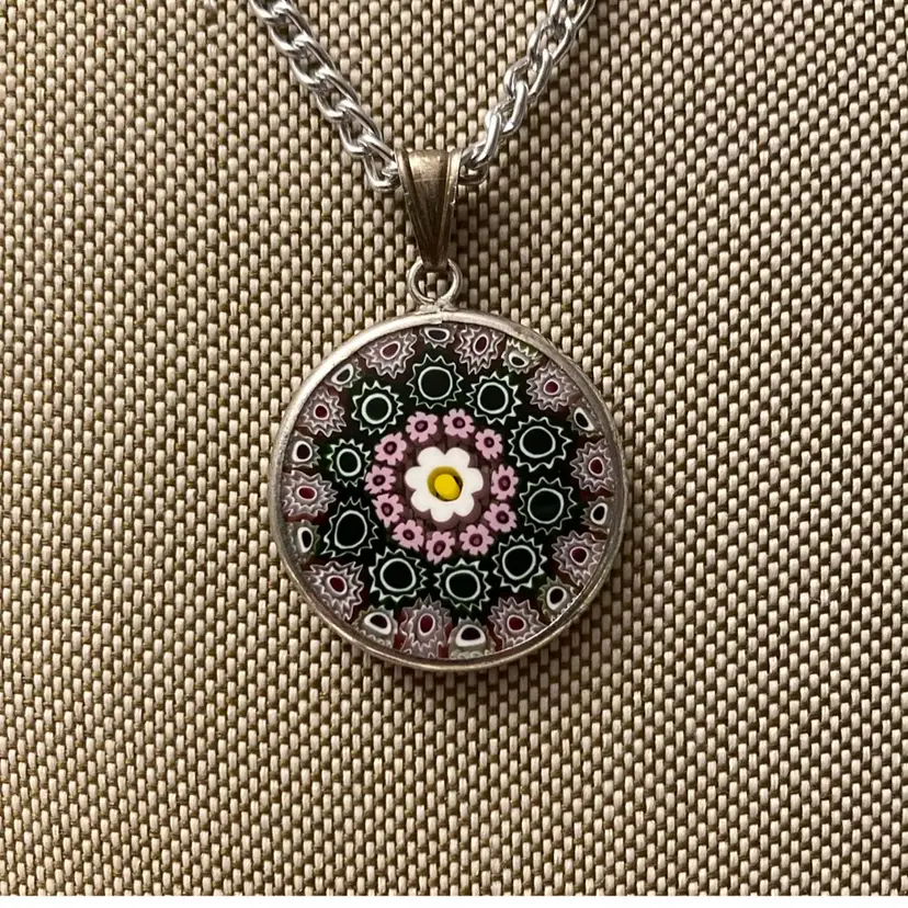 Vintage sterling silver Italian millefiori floral pendant. Only the oendant is sterling. I just added a silver tone chain for displaying the piece. You can add your own chain if you would like. The pendant measures 1” x 1 1/8”. It is marked Italy and 925.