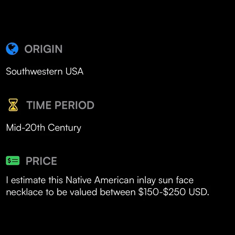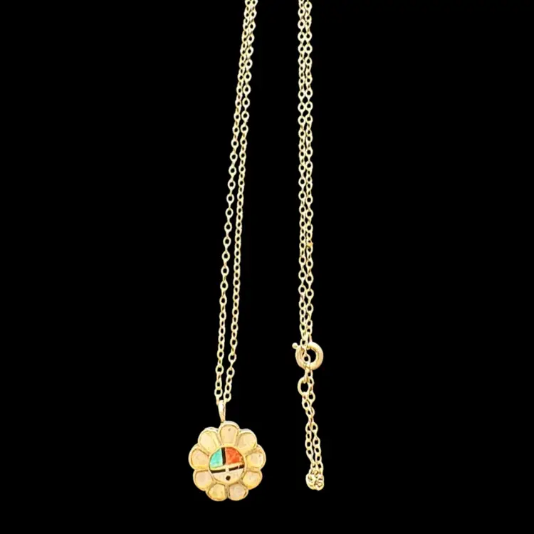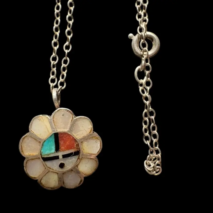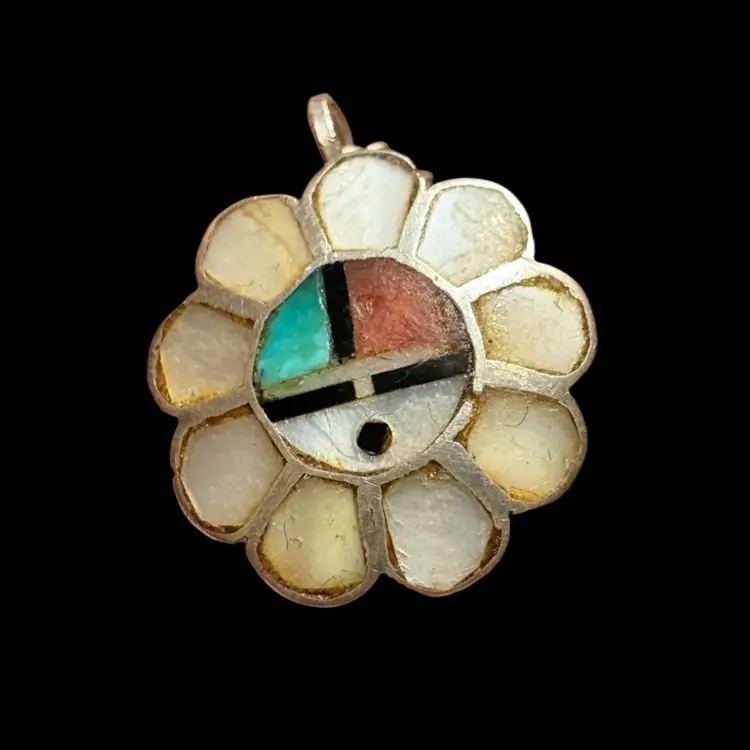 Native American inlay jewelry, particularly from the Zuni and Hopi tribes, is renowned for its intricate craftsmanship and symbolic designs. This technique involves precisely cutting and fitting small pieces of stone, shell, and other materials into a base, often silver, to create detailed patterns. The sun face, or 'Shalako' in Zuni tradition, is a common motif representing life, warmth, and prosperity, often depicted with a mask-like face and rays emanating outwards. These pieces are highly sought after by collectors for their cultural significance and artistic merit.