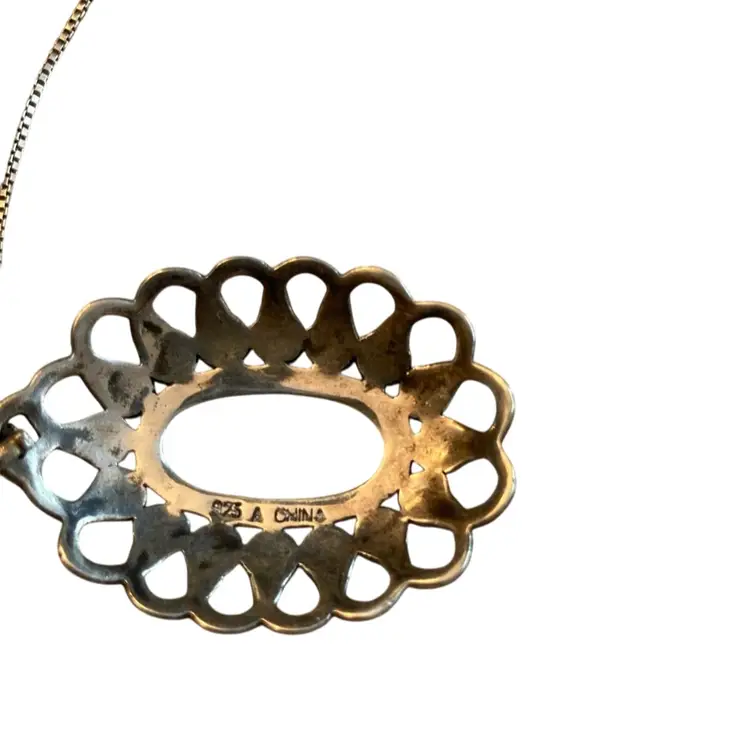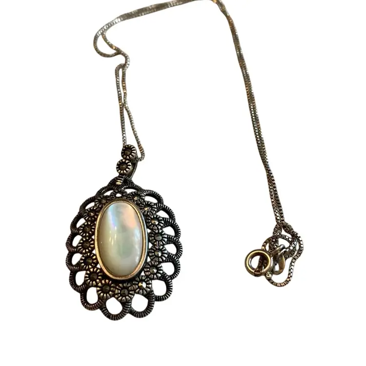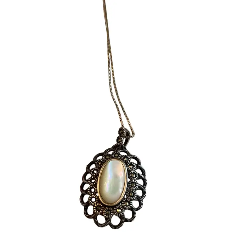 Pendant is marked 925 and looks like sterling silver but is untested. Chain is not silver. Stone looks like Mother of Pearl