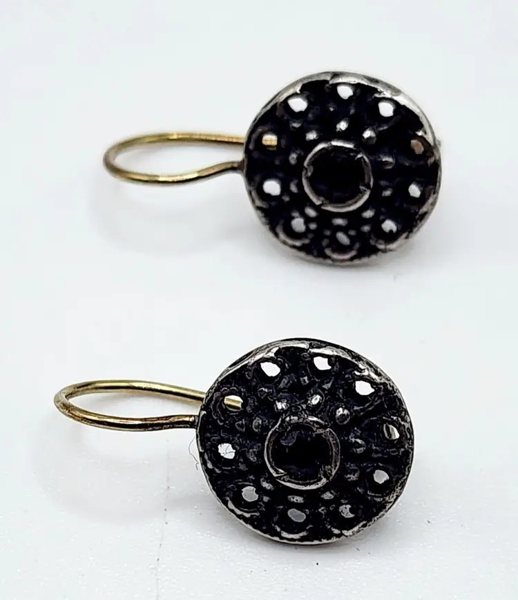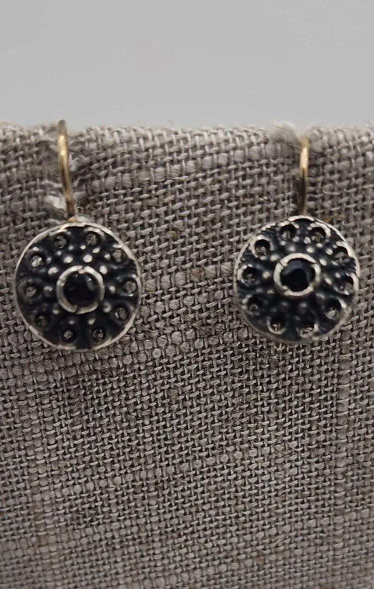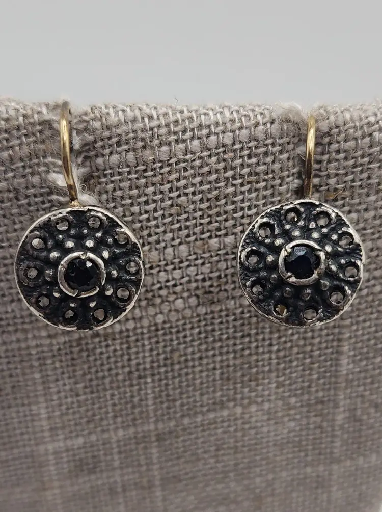 Size: .75" Color: Black, silver Condition: Very good vintage Signed: None Details: Pierced Earrings. Stones are tested for sapphire. The bottom of the earrings has been tested as sterling, but not the ear wires.