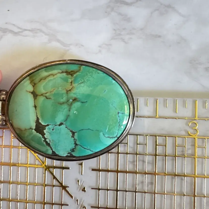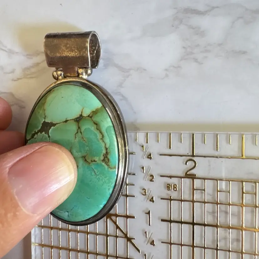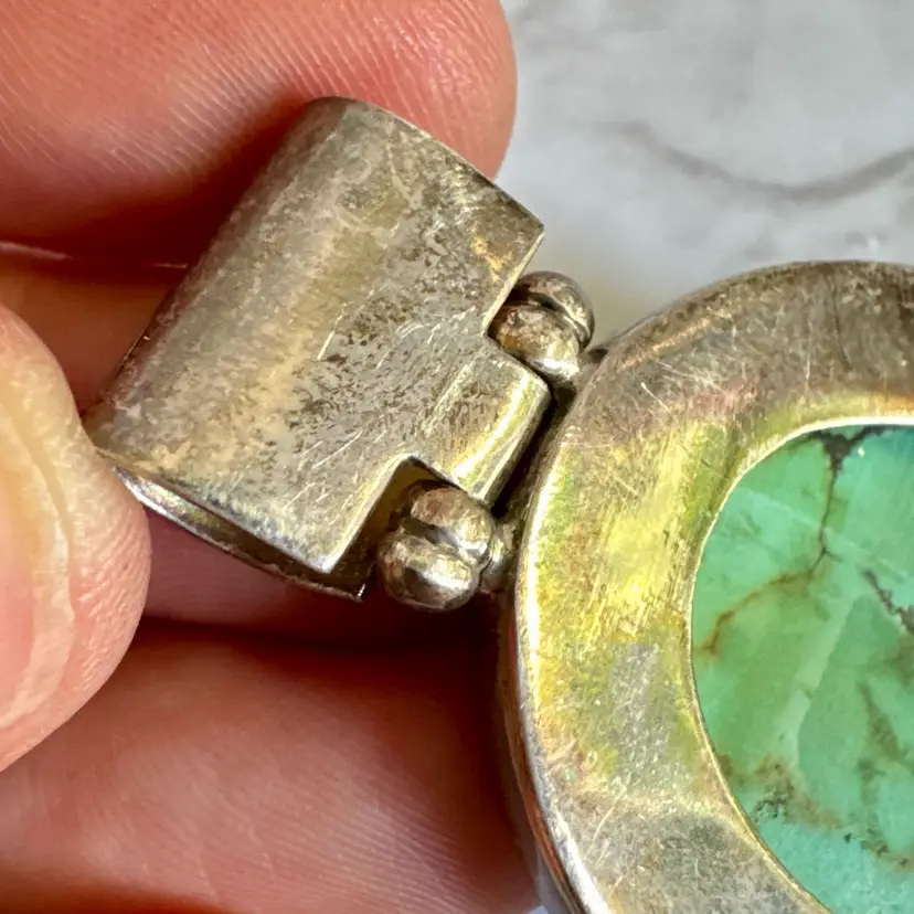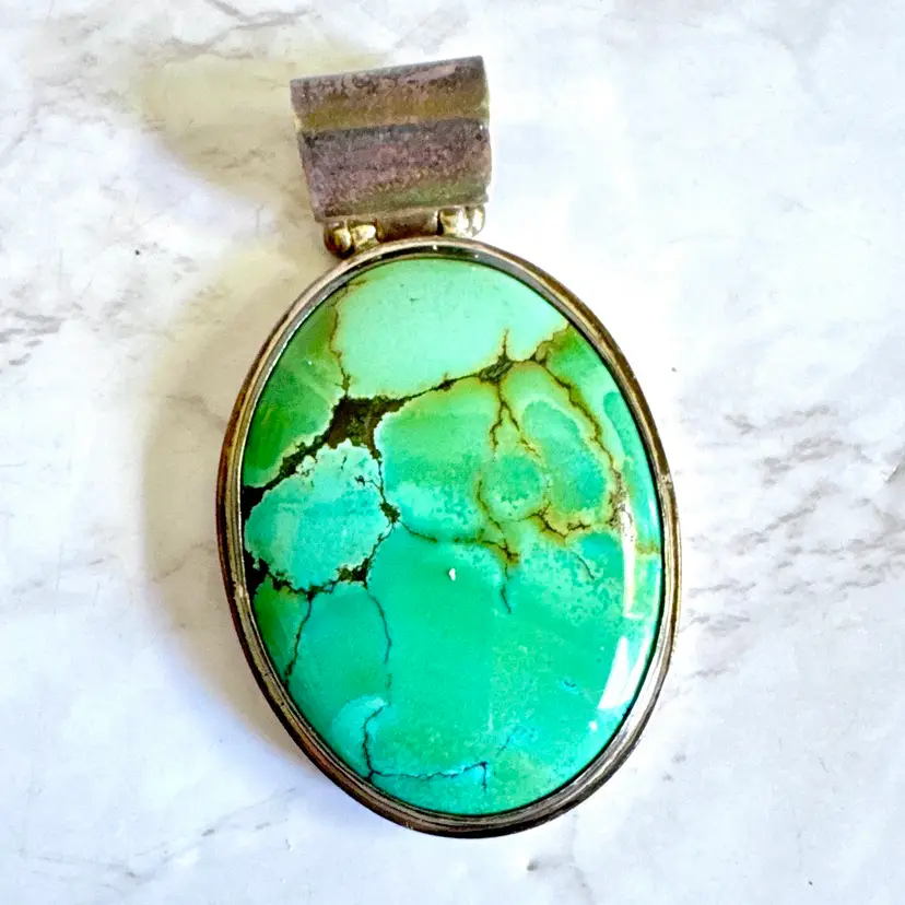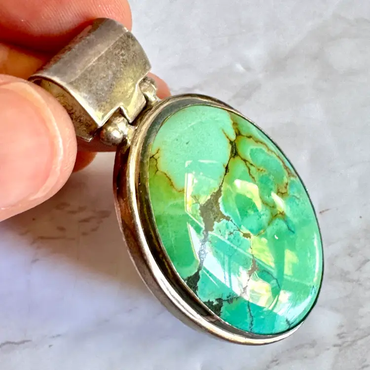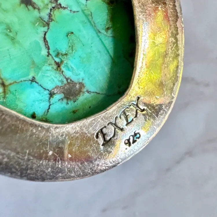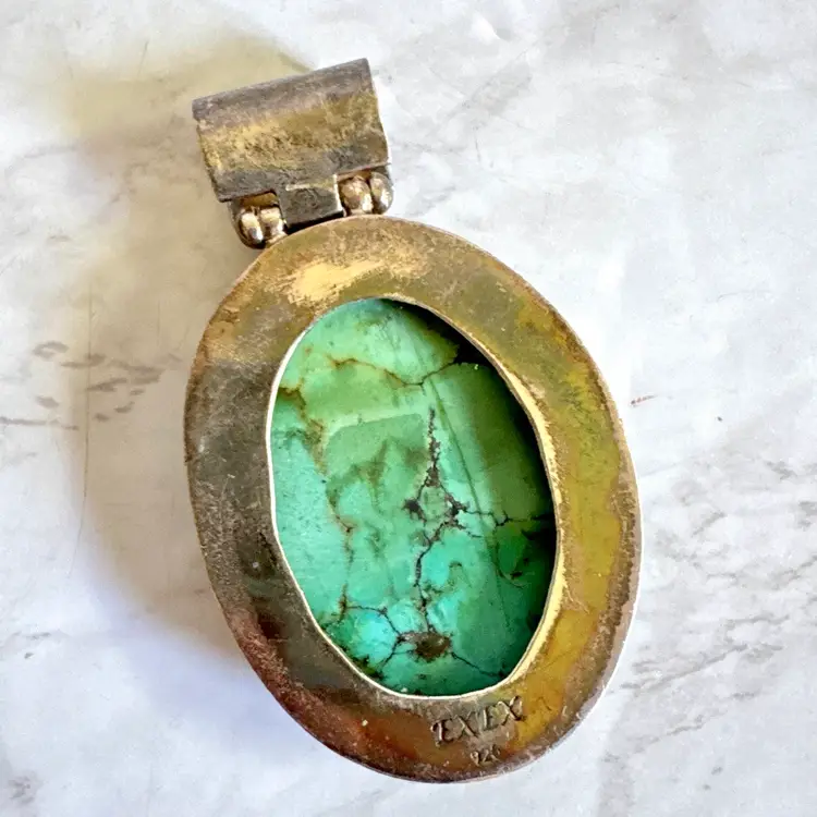 Capture timeless Southwestern elegance with this signed EXEX sterling silver turquoise pendant, crafted by the renowned Southern California designer Claudia Agudelo (founded 1989, beloved by celebrities like Jennifer Lopez and Halle Berry). Featuring a large oval cabochon of vibrant natural turquoise with bold black and green matrix veining, bezel-set in a smooth, minimalist frame. Measuring 1-1/4 inches wide by 2-1/4 inches high and weighing 24 grams, this 925-marked and tested piece showcases clean craftsmanship and authentic stone character. In good condition with signs of wear indicative of age, it adds vintage charm to any look. Perfect as a solo statement or layered—no chain included. Ships securely from a smoke-free home.