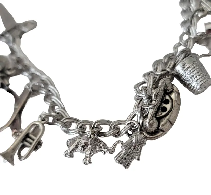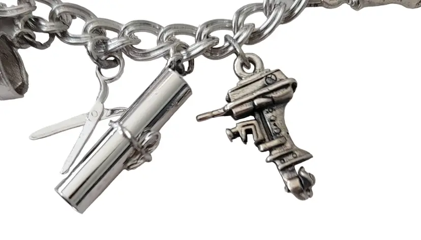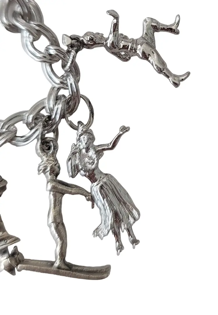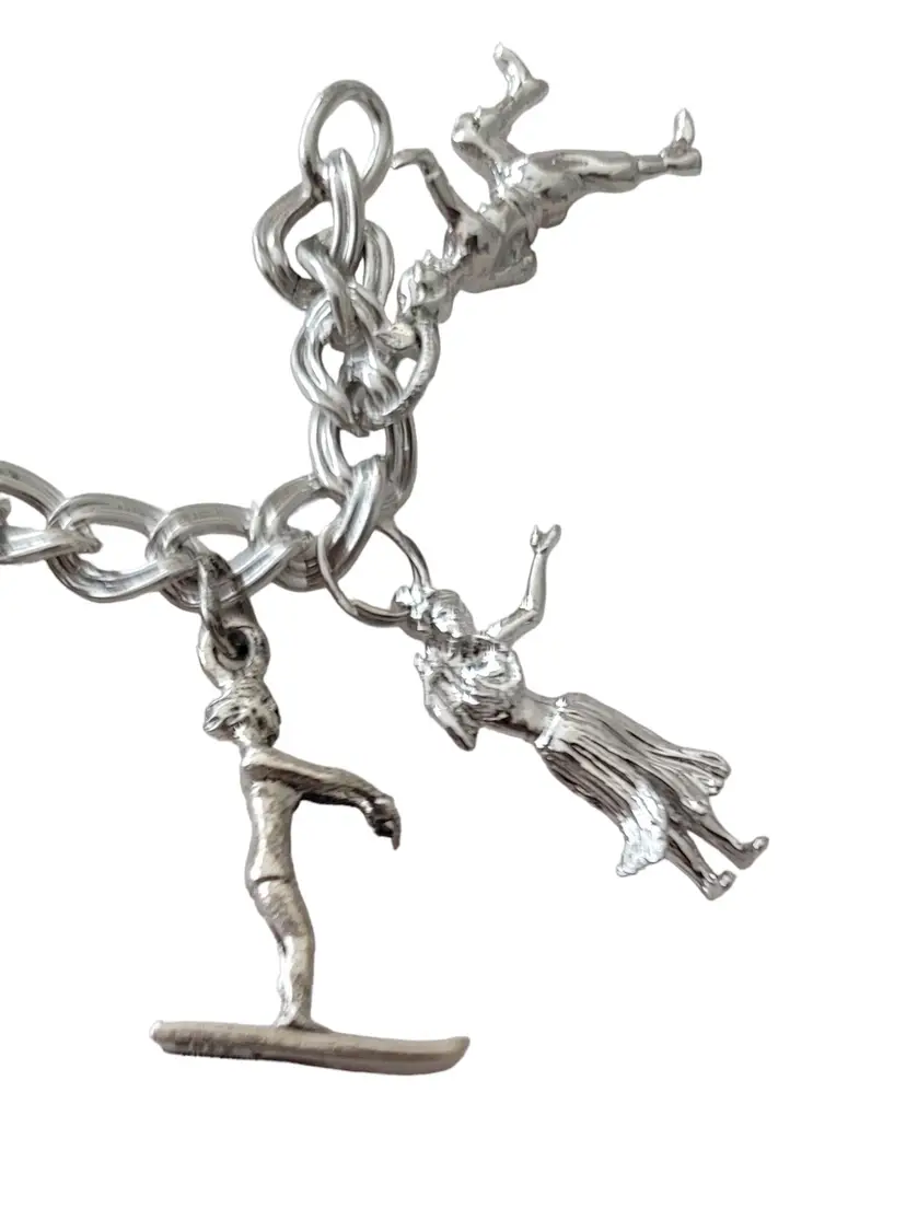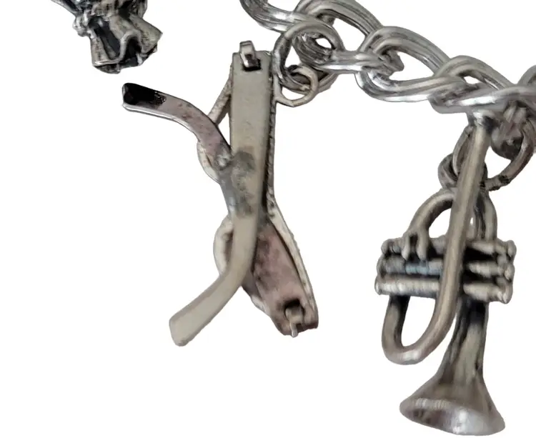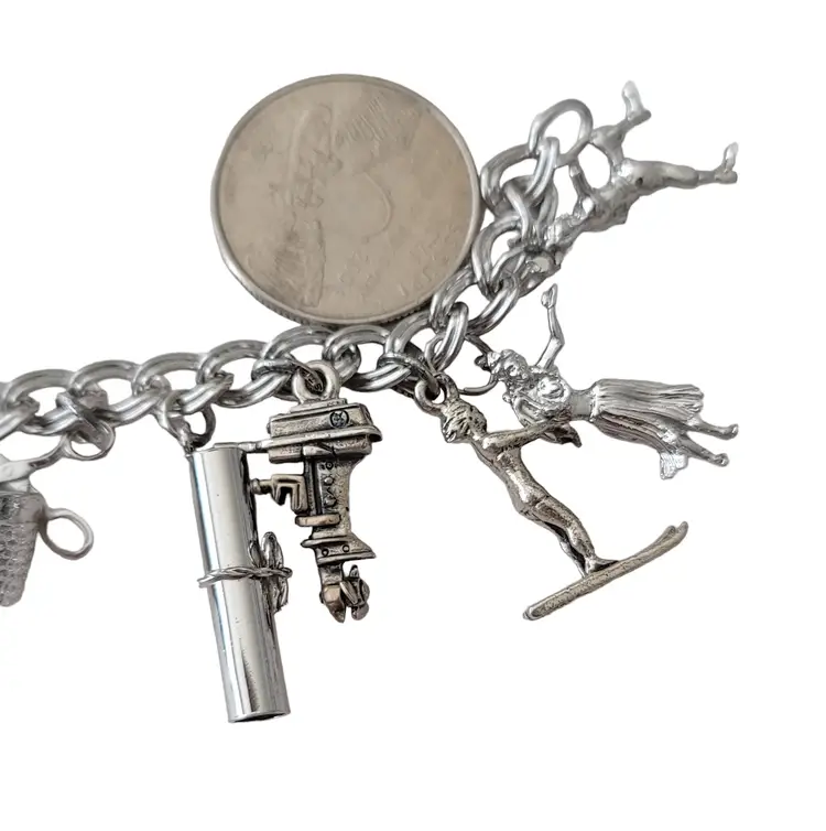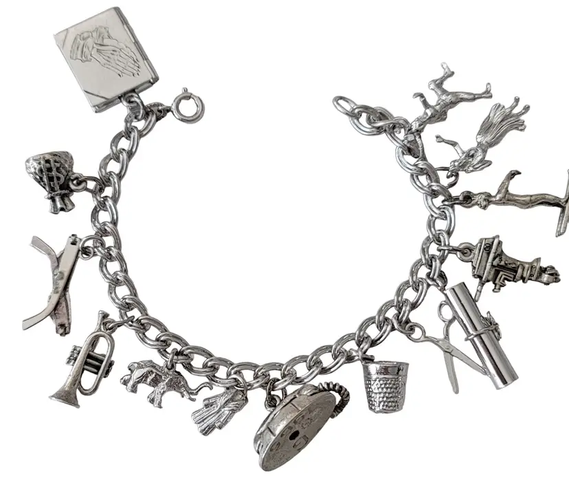 This lovely Vintage Sterling Silver Charm Bracelet is loaded with various charms. It consists of 14 charms, each individually attached to the chunky chain link. The charms included a prayer book locket, a bag of coins, a clipper, a trumpet, an elephant, a robe, an old telephone, a bucket, a pair of scissors, a tied rolled paper, a tool, a skier, a hula dancer and a martial artist that are finely crafted from solid Sterling Silver. This bracelet measures 7 inches long and is perfectly designed to adorn your wrist with elegance and style. This handsome bracelet makes a heartfelt thank-you gift and the perfect accessory to enhance your everyday look.