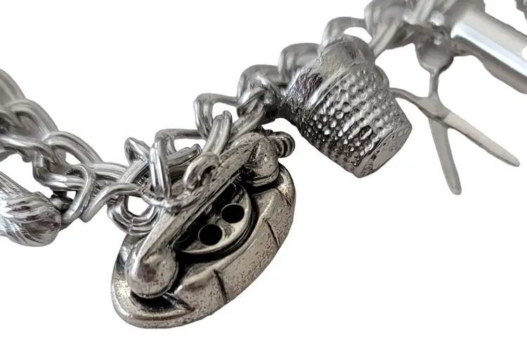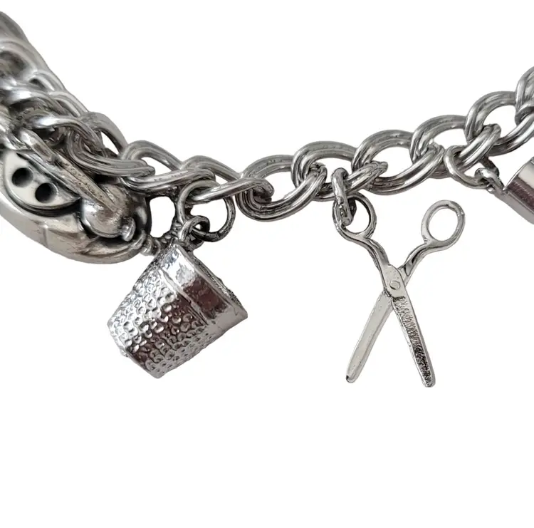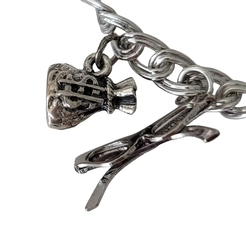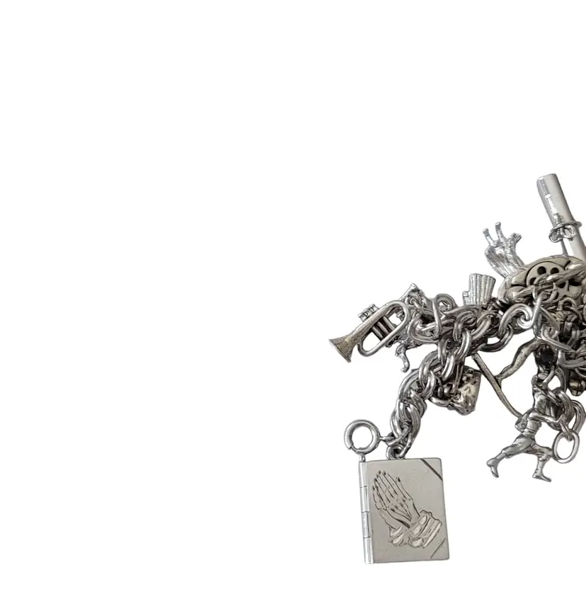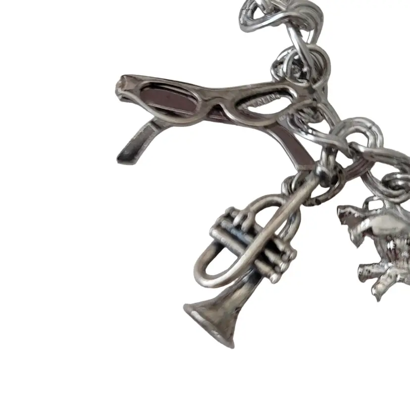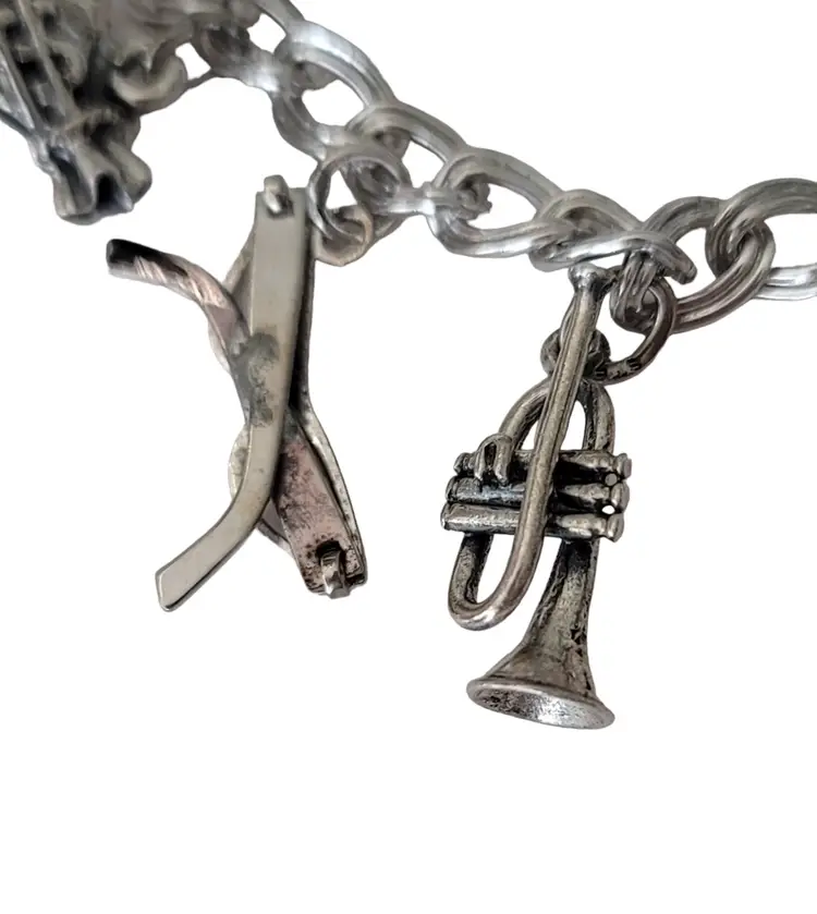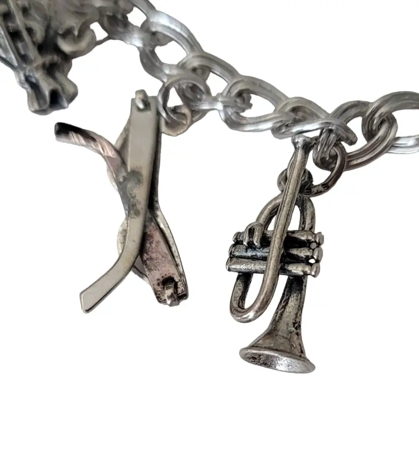 This lovely Vintage Sterling Silver Charm Bracelet is loaded with various charms. It consists of 14 charms, each individually attached to the chunky chain link. The charms included a prayer book locket, a bag of coins, a clipper, a trumpet, an elephant, a robe, an old telephone, a bucket, a pair of scissors, a tied rolled paper, a tool, a skier, a hula dancer and a martial artist that are finely crafted from solid Sterling Silver. This bracelet measures 7 inches long and is perfectly designed to adorn your wrist with elegance and style. This handsome bracelet makes a heartfelt thank-you gift and the perfect accessory to enhance your everyday look.